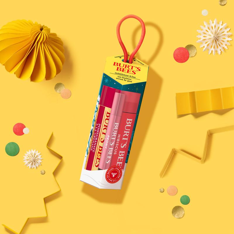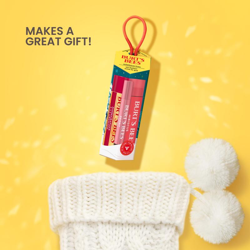 ·One Burt's Bees Mistletoe Kiss Lip Balm, Tinted Lip Balm and Lip Shimmer Gift Sets in festive holiday packaging that's ready to give—no wrapping required.