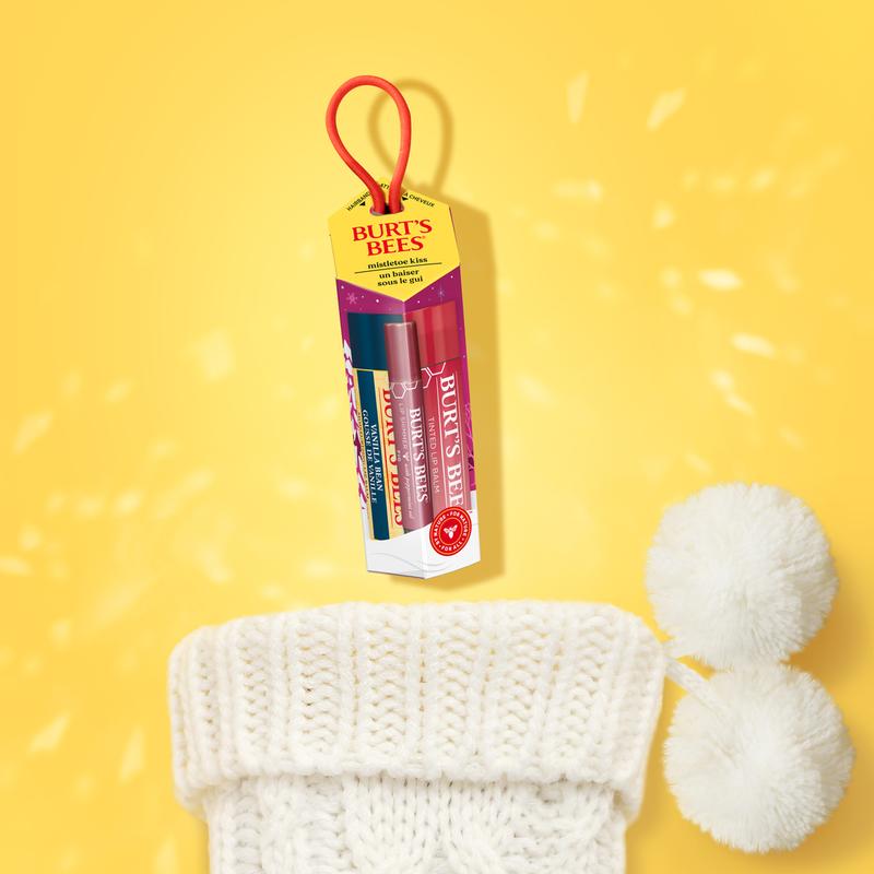 ·One Burt's Bees Mistletoe Kiss Lip Balm, Tinted Lip Balm and Lip Shimmer Gift Sets in festive holiday packaging that's ready to give—no wrapping required.