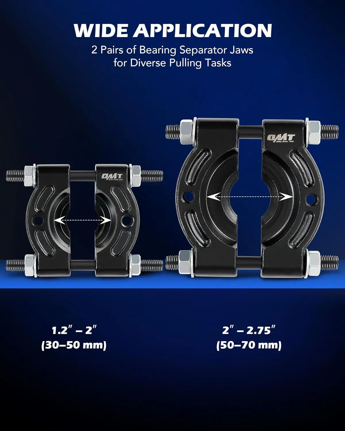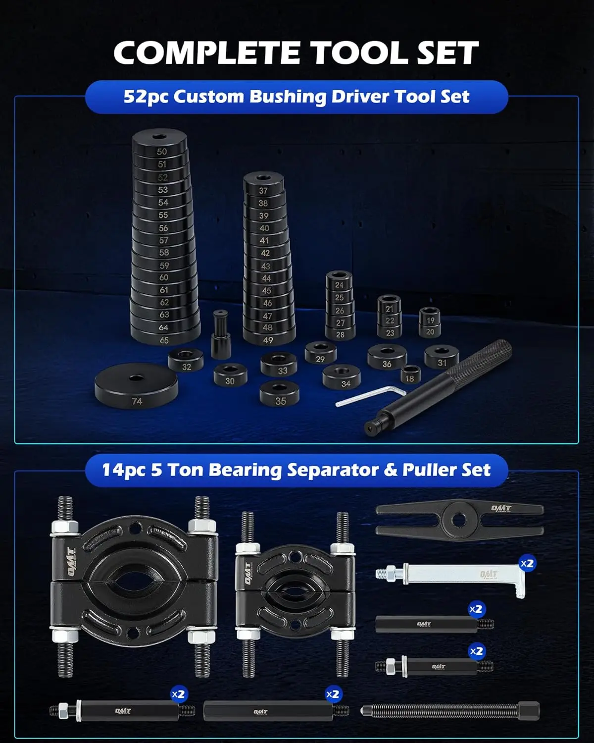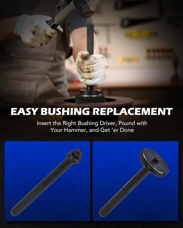 Effortlessly remove large or small bearings on most vehicles with the bearing separator, while the bushing driver tool set covers sizes from 18 to 65 mm, plus 74 mm, ensuring compatibility with most cars, ATVs, and light trucks