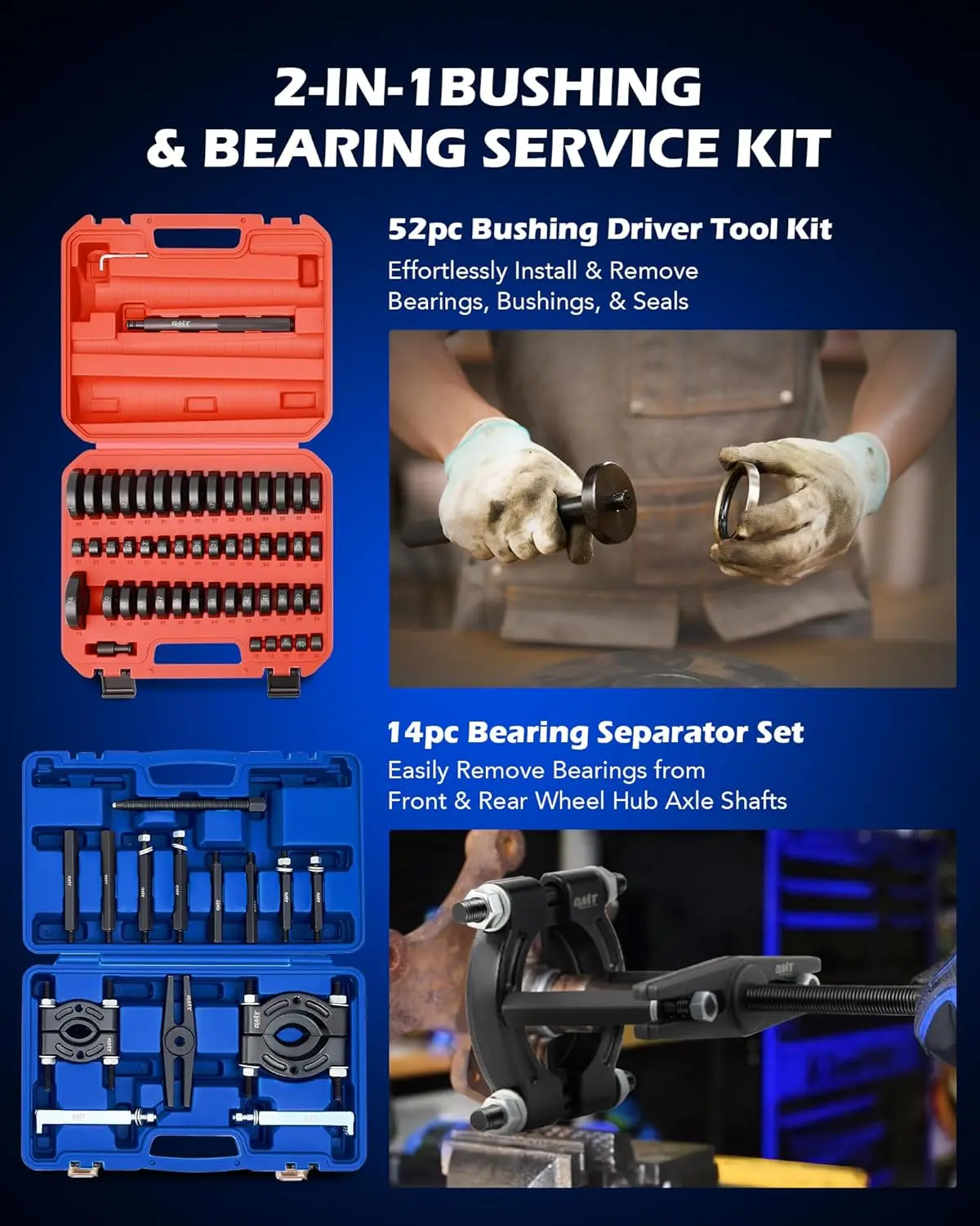 Orion Motor Tech's 2-in-1 bushing and bearing service kit offers a comprehensive solution for your maintenance tasks, making it easy to handle bushings and seals, and to remove bearings, gears, pulleys, and steering wheels
