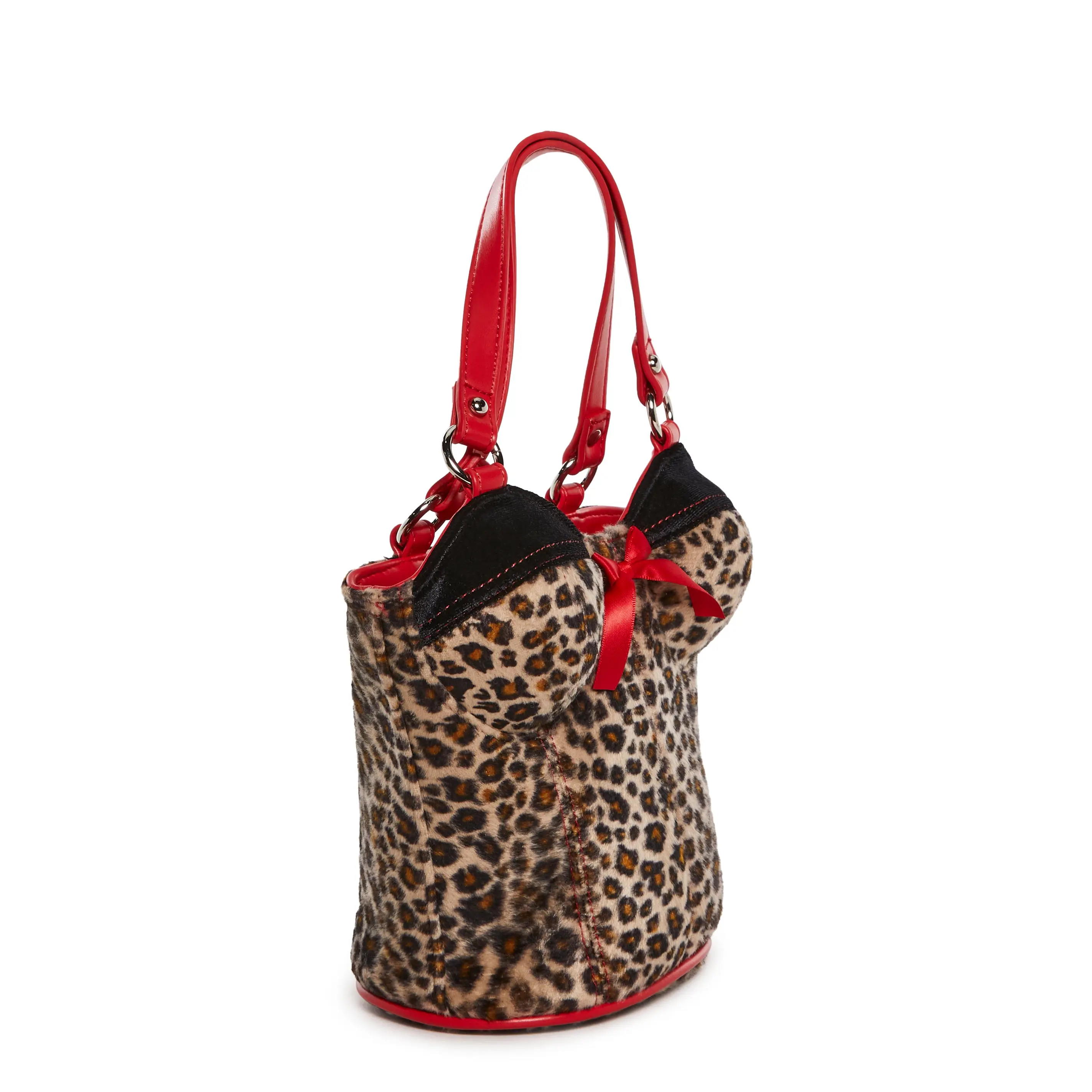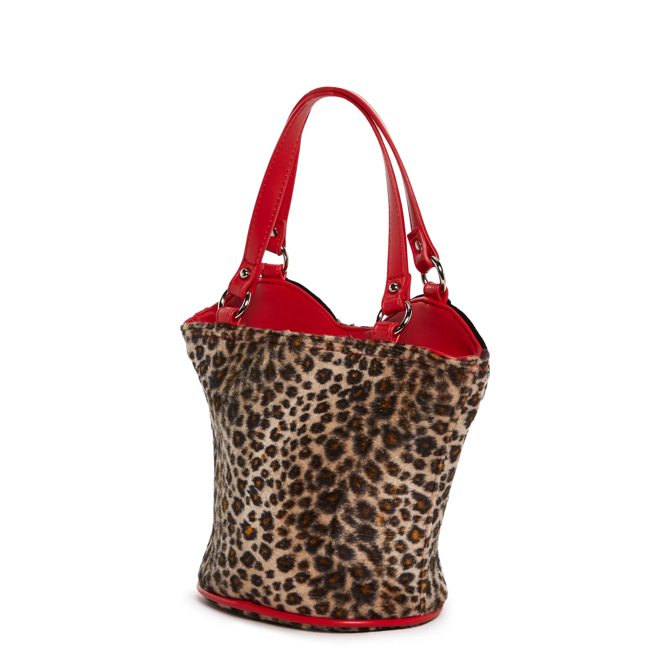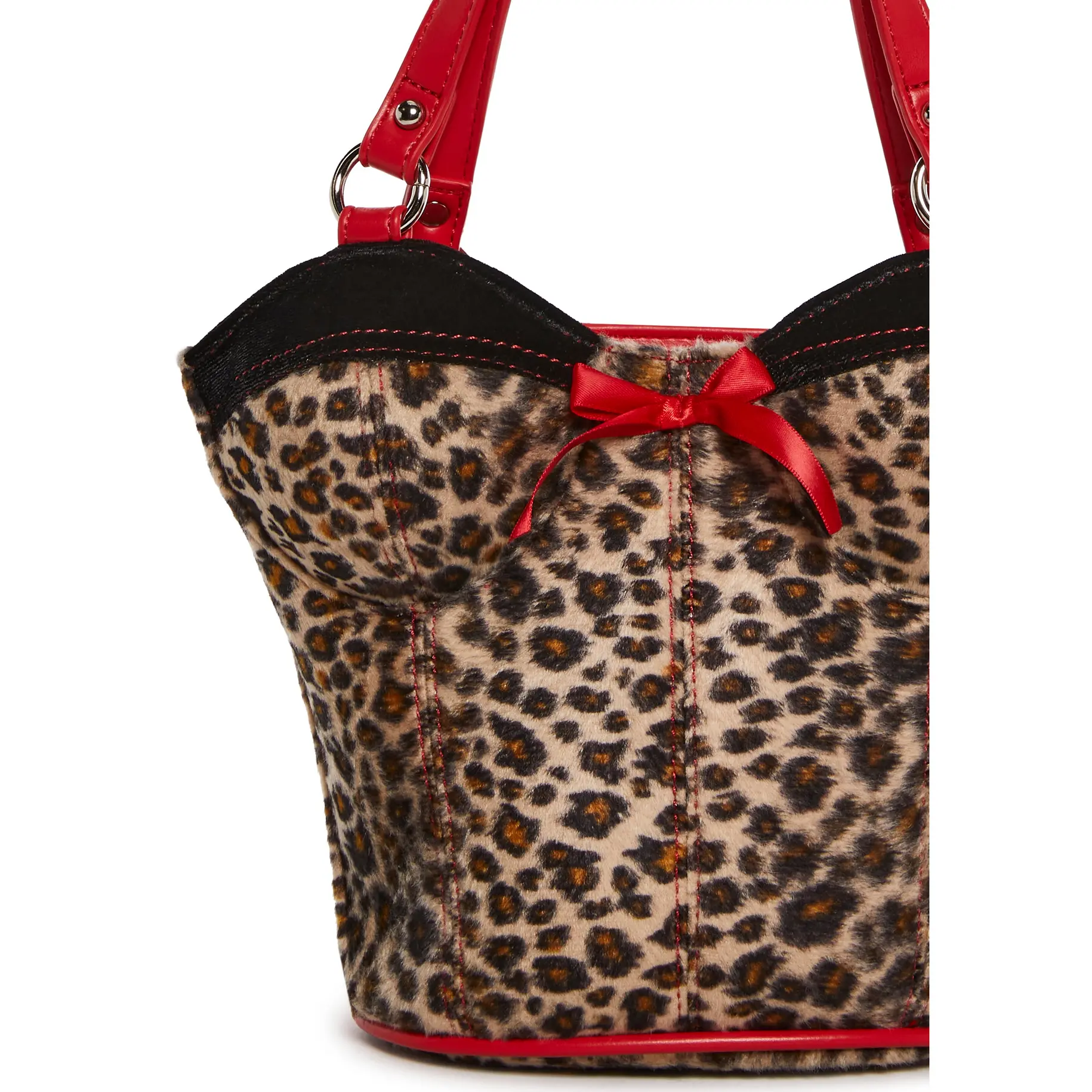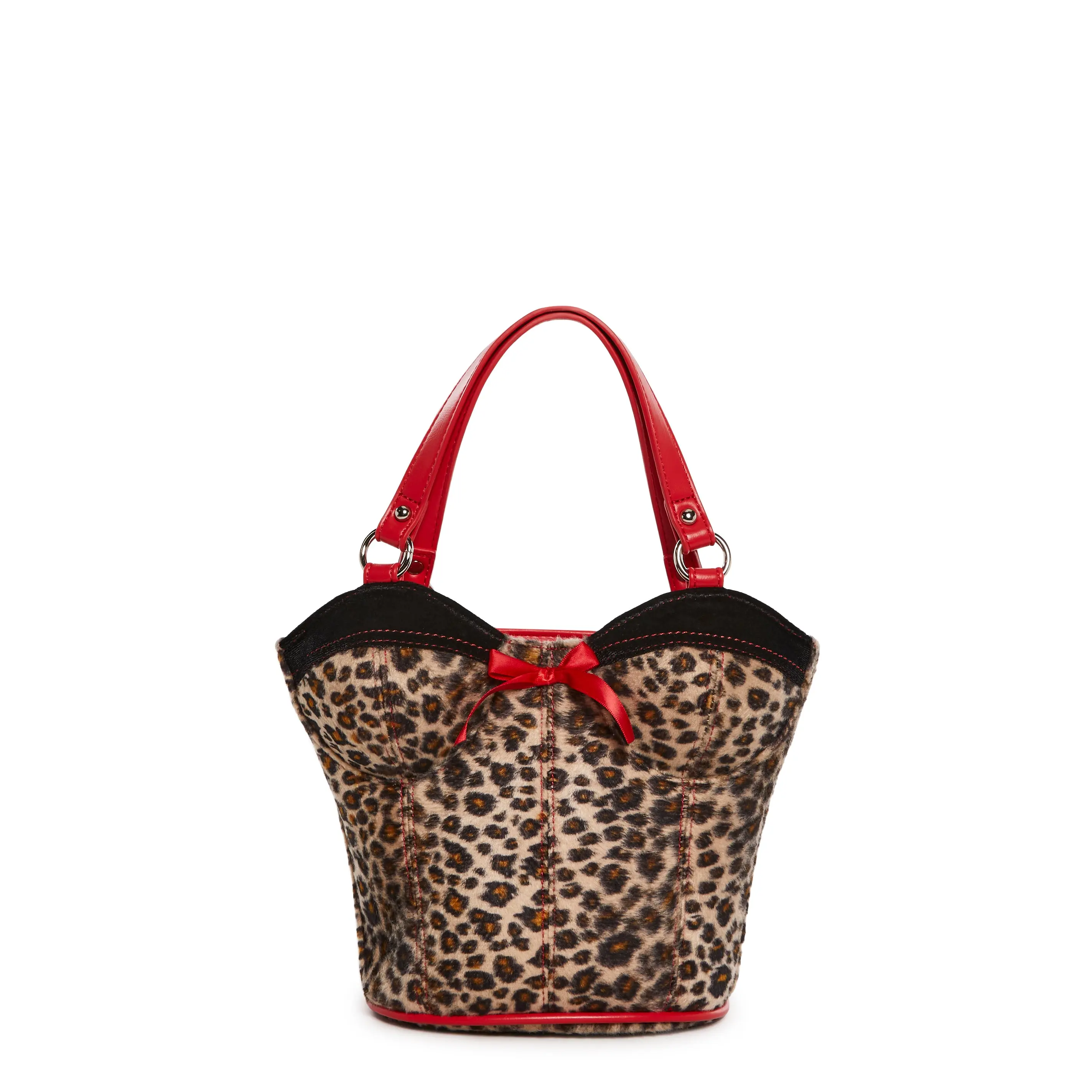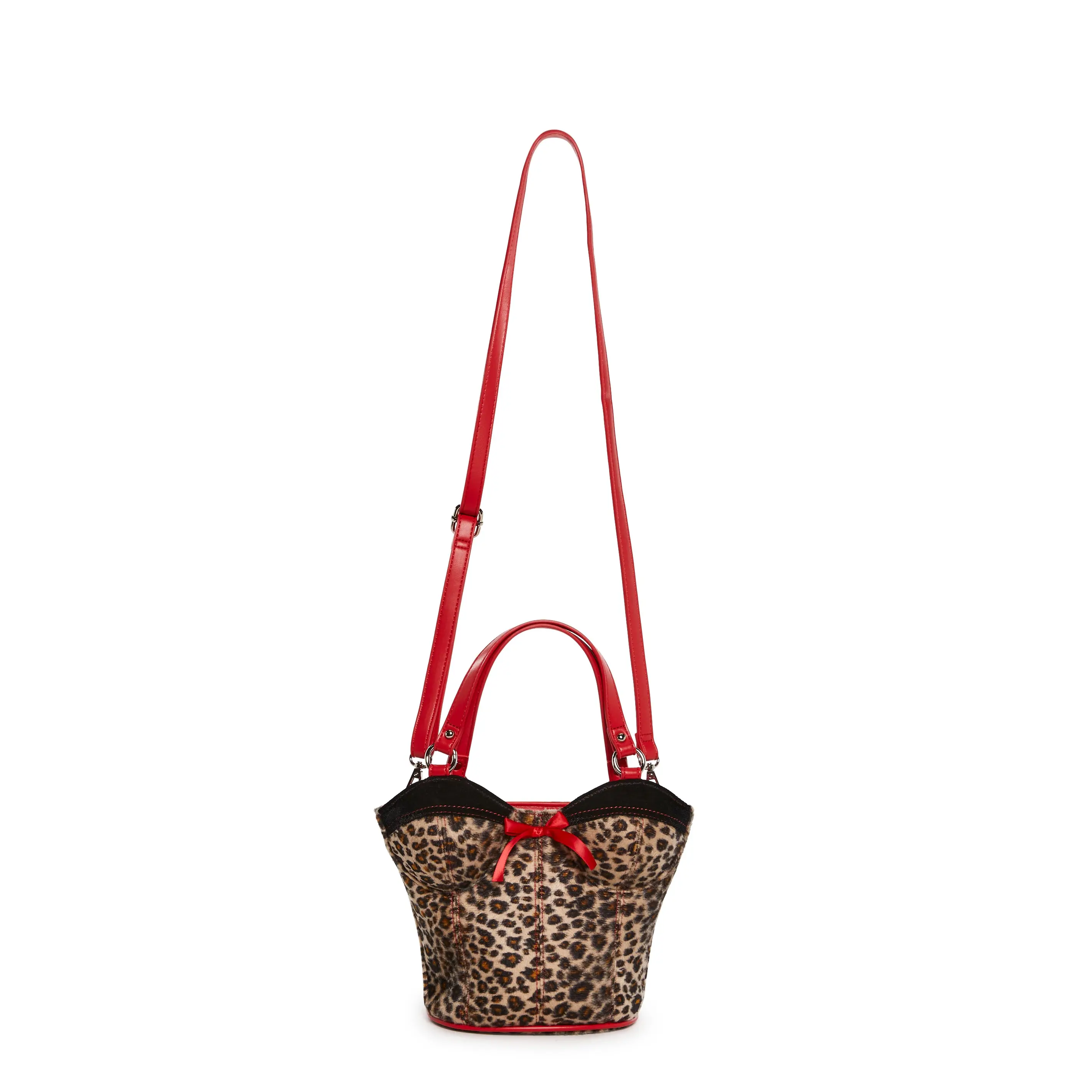 This bustier-shaped shoulder bag has a faux fur construction with an all-over leopard print, vegan leather top handles and a removable shoulder strap, a front bow applique, o-ring hardware, and a top zipper closure.