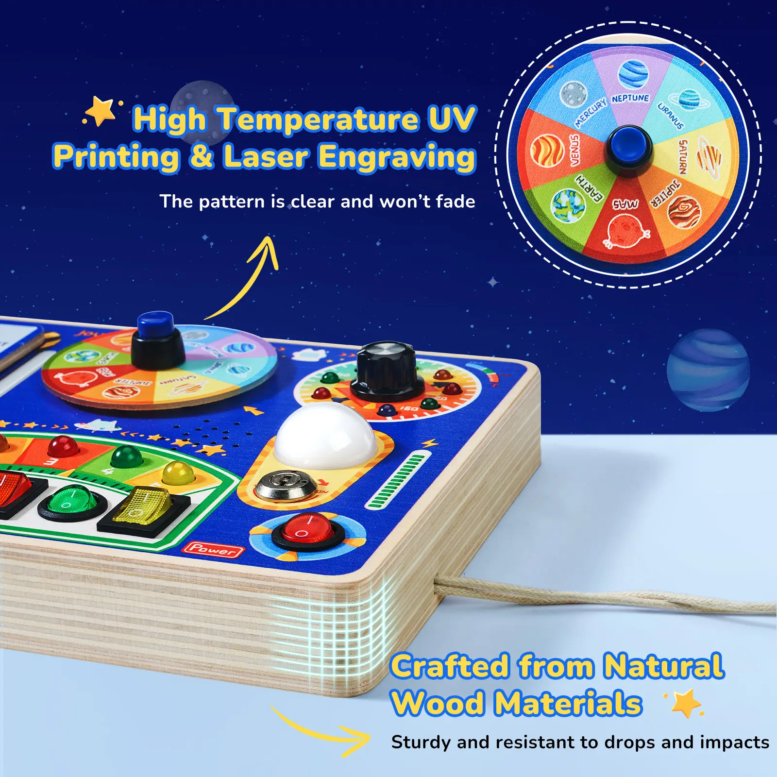 Is a great busy board with different buttons than normal ones