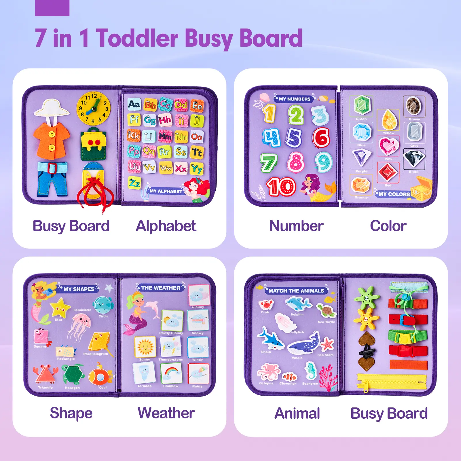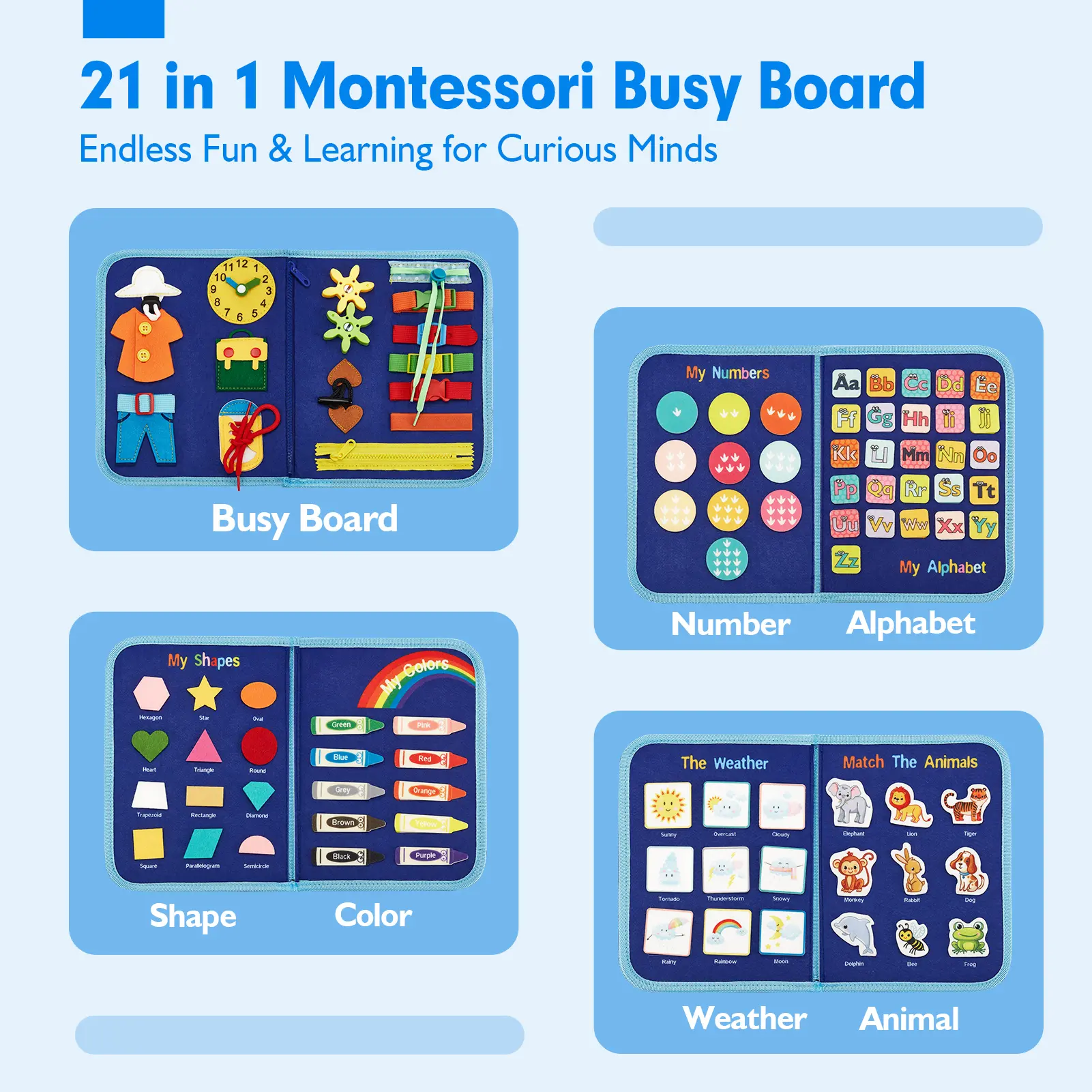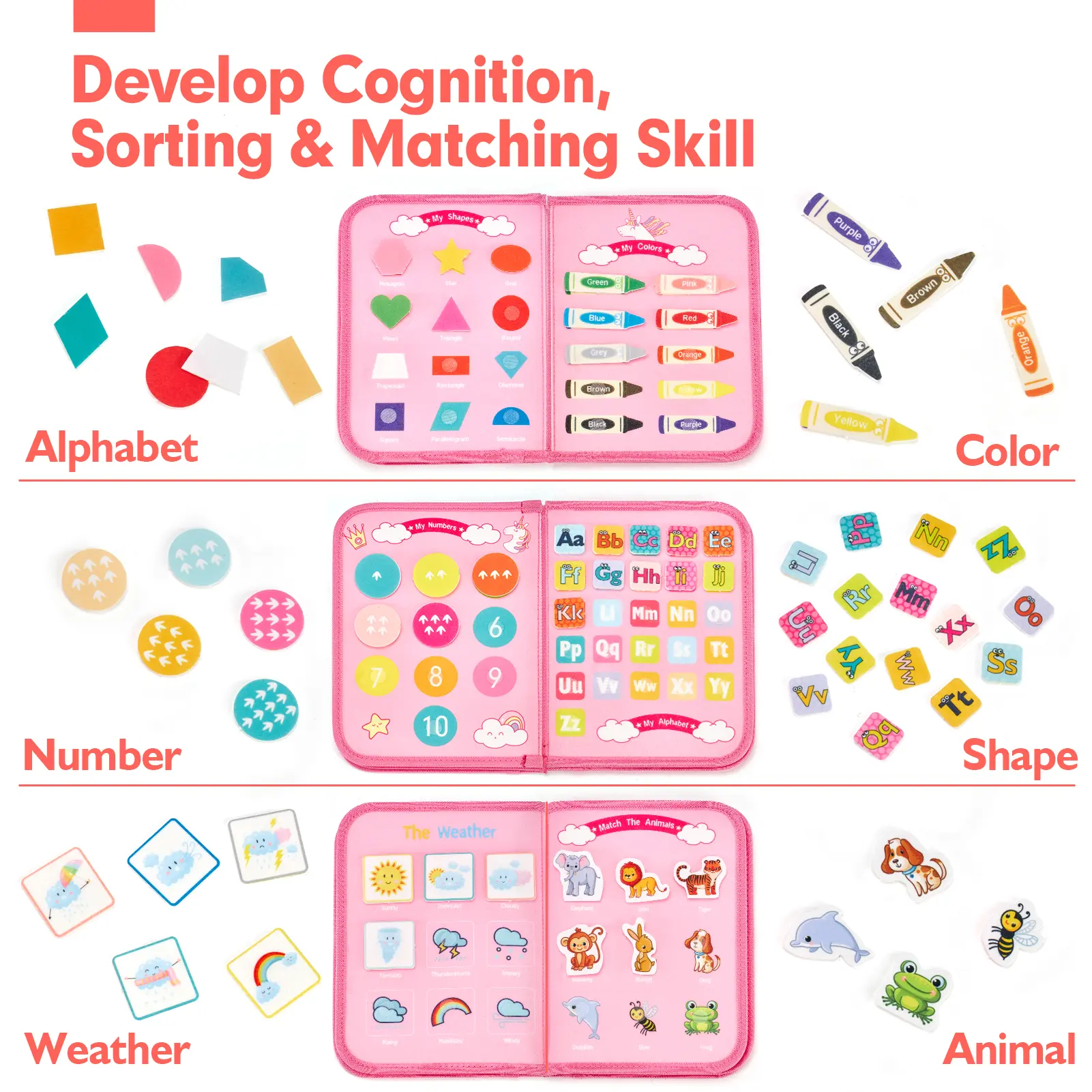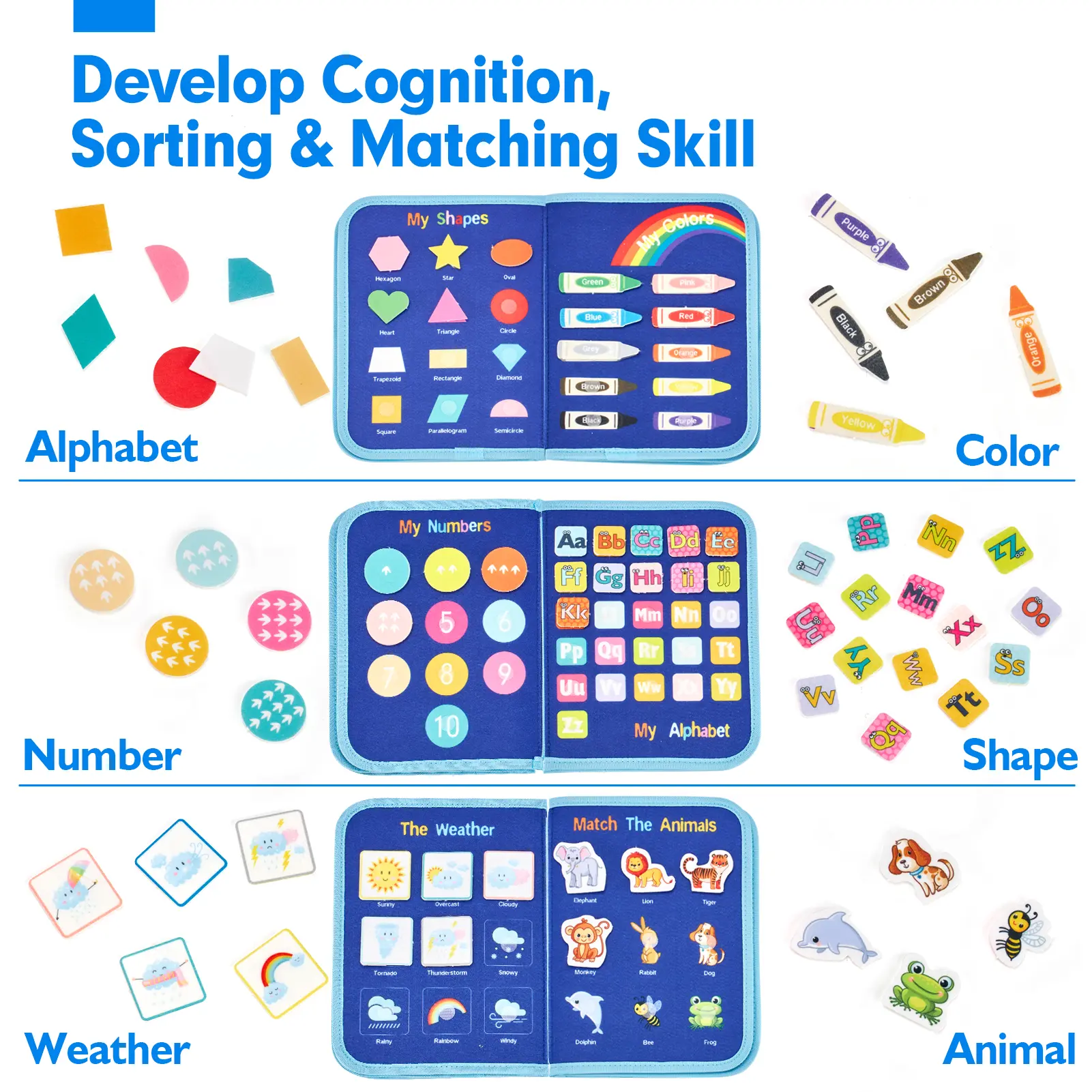 ·Boost Cognitive Development: Includes 6 themed boards for learning letters, numbers, colors, shapes, animals, and weather. All pieces attach with secure hook-and-loop fasteners for easy sorting and matching play, making it an ideal educational toy for cognitive growth.