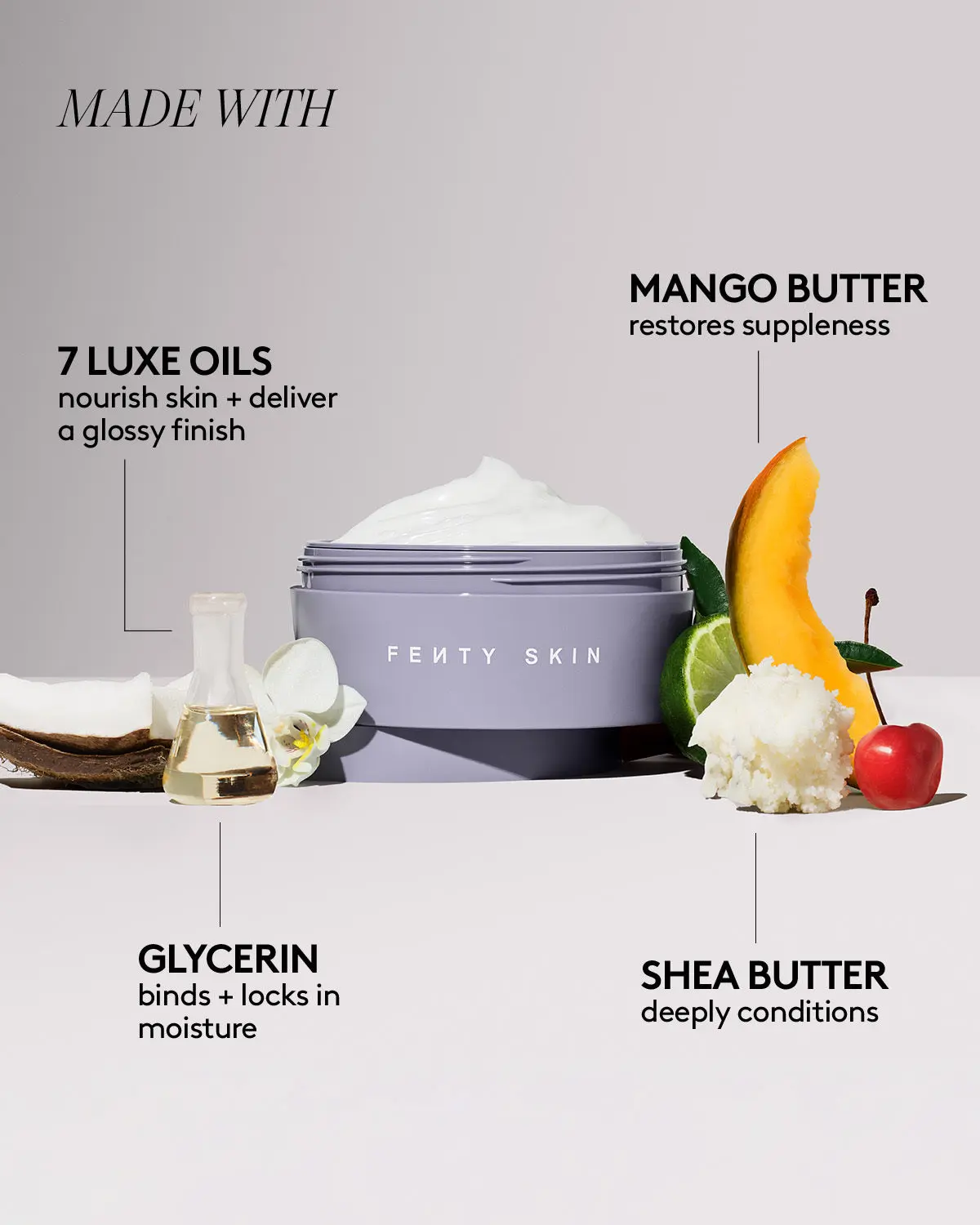 A thick, rich, luxed-up body moisturizer that buttas you up in nourishing hydration that lasts. Dip into this whipped oil cream loaded with nearly 25% rich butters, restorative tropical oils and extracts.