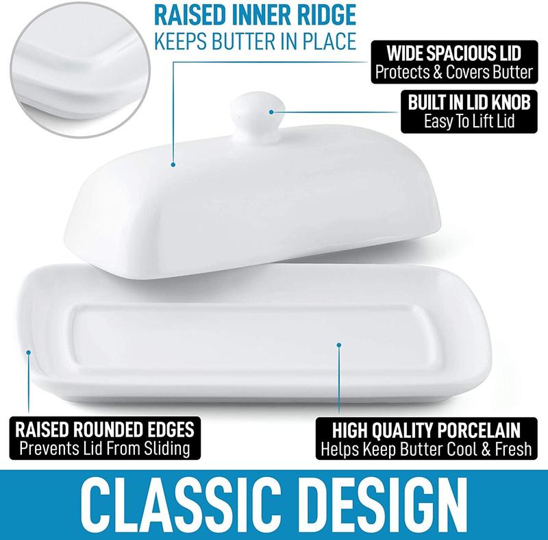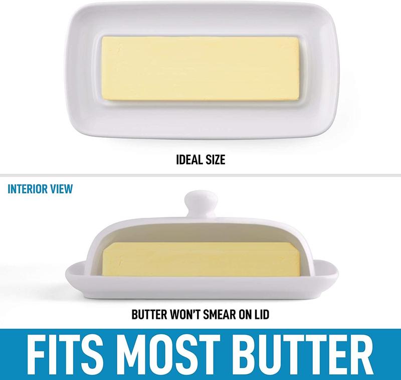 ·No Mess Design: Featuring raised rounded edges and a convenient knob on top, this butter dish allows for easy lifting without any mess. The rounded-edge ridge keeps the butter stick secure while cutting, ensuring a tidy experience. Dimensions: 7.3" x 3.5" for the holder; 6.5" x 2.5" x 2.5" for the lid.