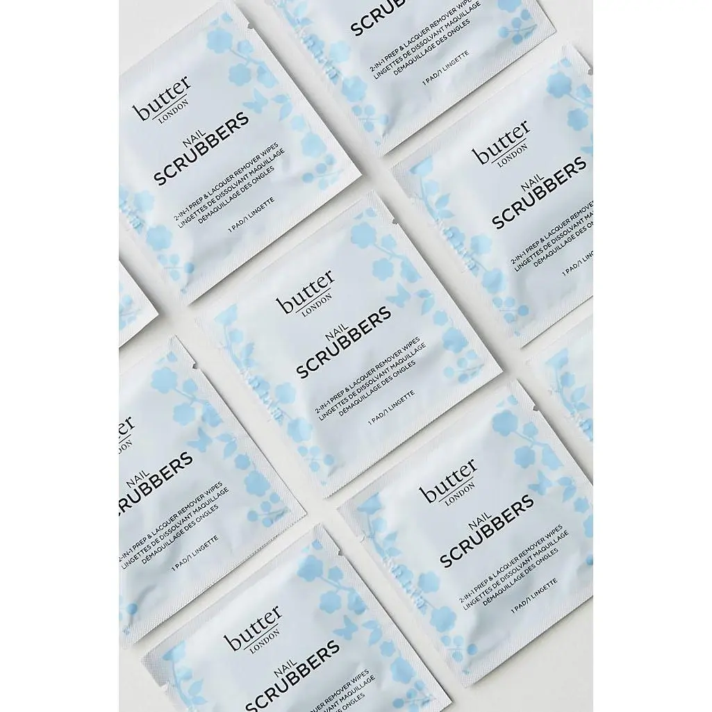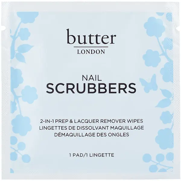 Say goodbye to yesterday’s stubborn nail lacquer and glitter in one easy step with the new and improved dual-sided butter LONDON Nail Scrubbers. Intensely saturated and easy-to-use, this set of 50 large 2-in-1 nail prep and lacquer remover wipes prep and condition your nails for your next flawless manicure or pedicure with ease. One side is soft, while the other side is textured to gently remove more stubborn nail lacquer and nail glitter from all ten nails. The vitamin-enriched nail polish remover formula hydrates and nourishes nails and cuticles with conditioning Vitamin E and soothing Aloe to prep nails for their next perfectly polished look. These durable, individually wrapped wipes remove polish in a single swipe without fraying or tearing, making them perfect for travel or at-home care.