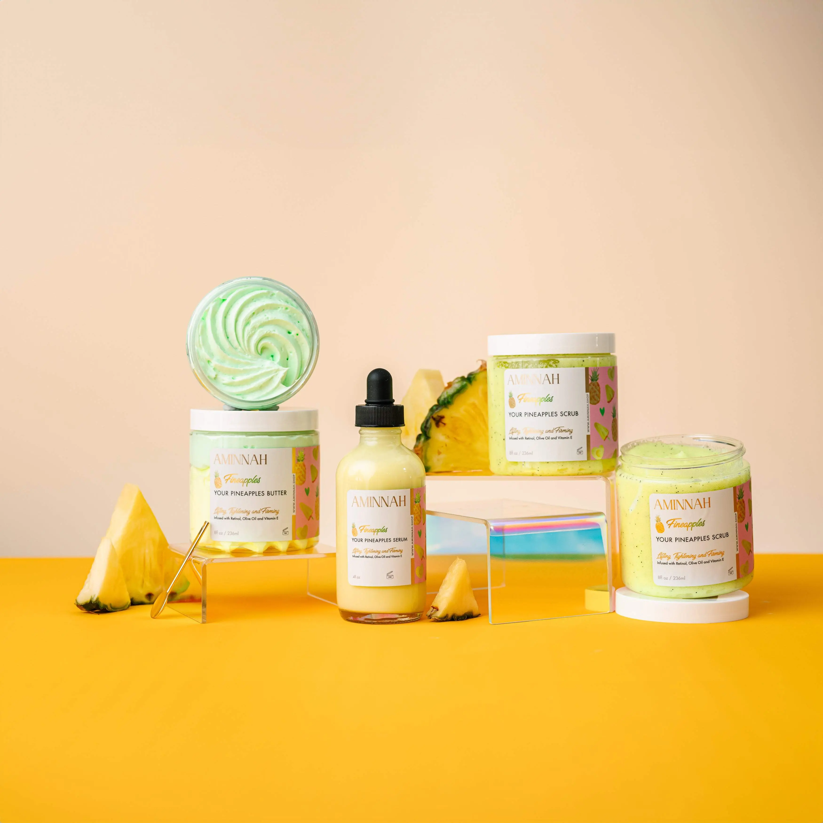 ·Organic shea butter, Coco butter, Mango butter, Coconut oil, Jojoba oil, Vitamin E, Fragrance, Cosmetic mica, Pineapple fruit extract, Retinol, Olive oil.