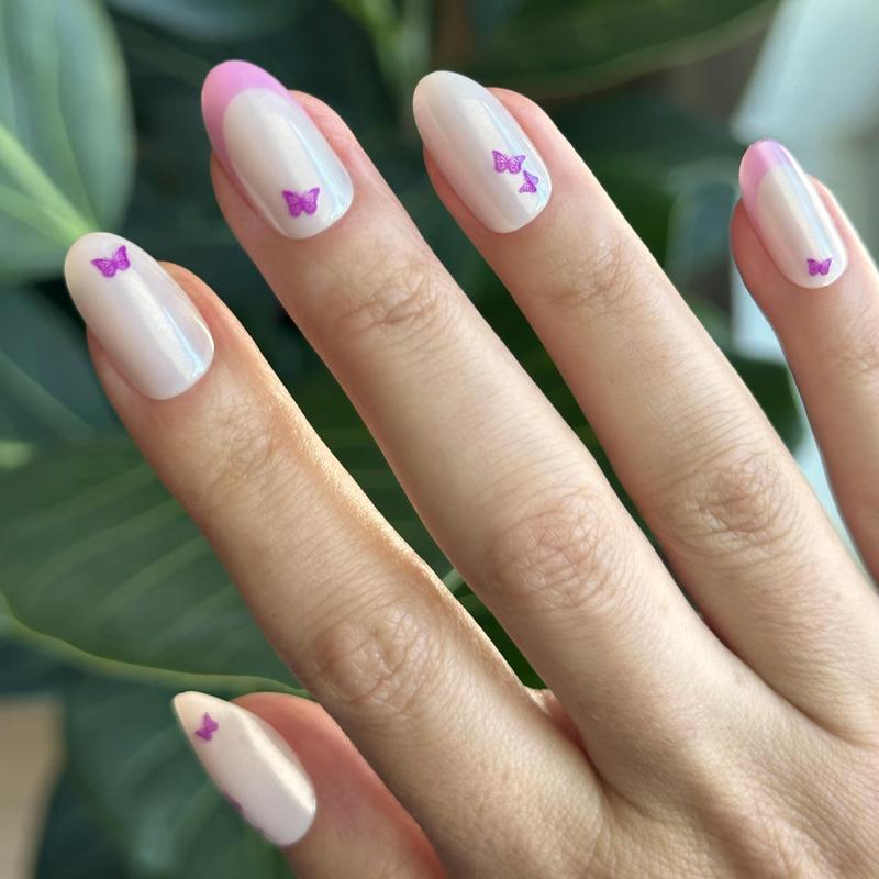 A shimmering neutral mani accented by pinky-purple french tips and tiny floating butterflies in a medium oval shape.“This butterfly set is the ultimate good luck mani.” XO SGT