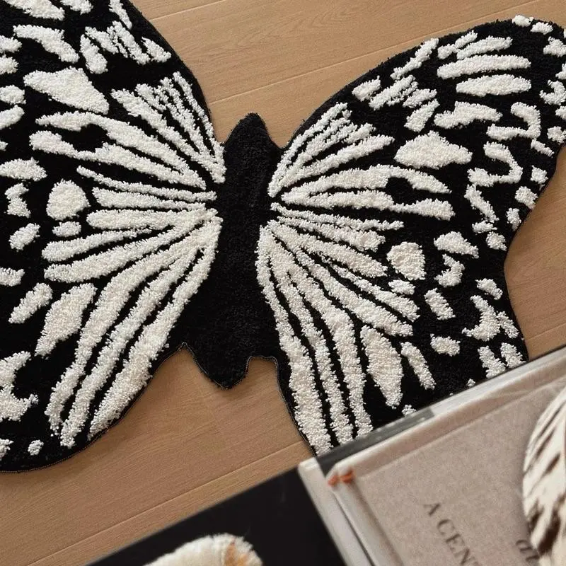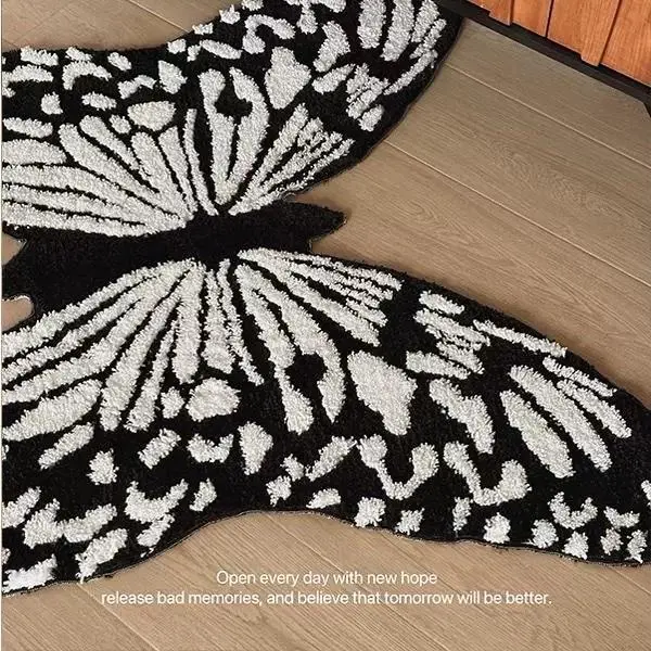 Elevate your home decor with this stunning butterfly-shaped rug, designed to add a touch of elegance and charm to any space.
