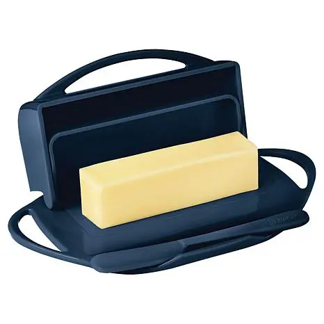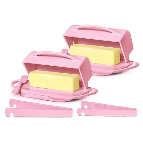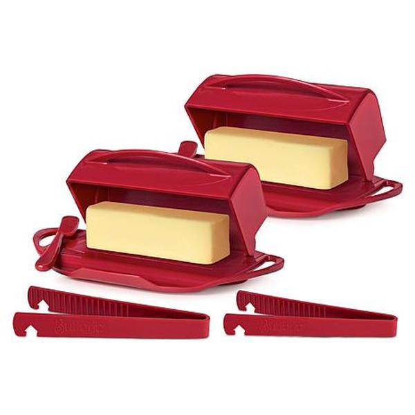 Butterie 2-pack Flip-Top Butter Dish with Matching Spreader & Tongs The stylish Butterie Flip-Top Butter Dish makes it so convenient to enjoy soft, spreadable butter anytime, without the mess of a traditional 2-piece butter dish. Designed with easy-grip handles and a nonstick base. Offered in a 2-pack, with matching spreader and tongs. BPA free. What You Get (2) Flip-top butter dishes (2) Matching spreaders (2) Matching pair of toaster tongs Use & care guide