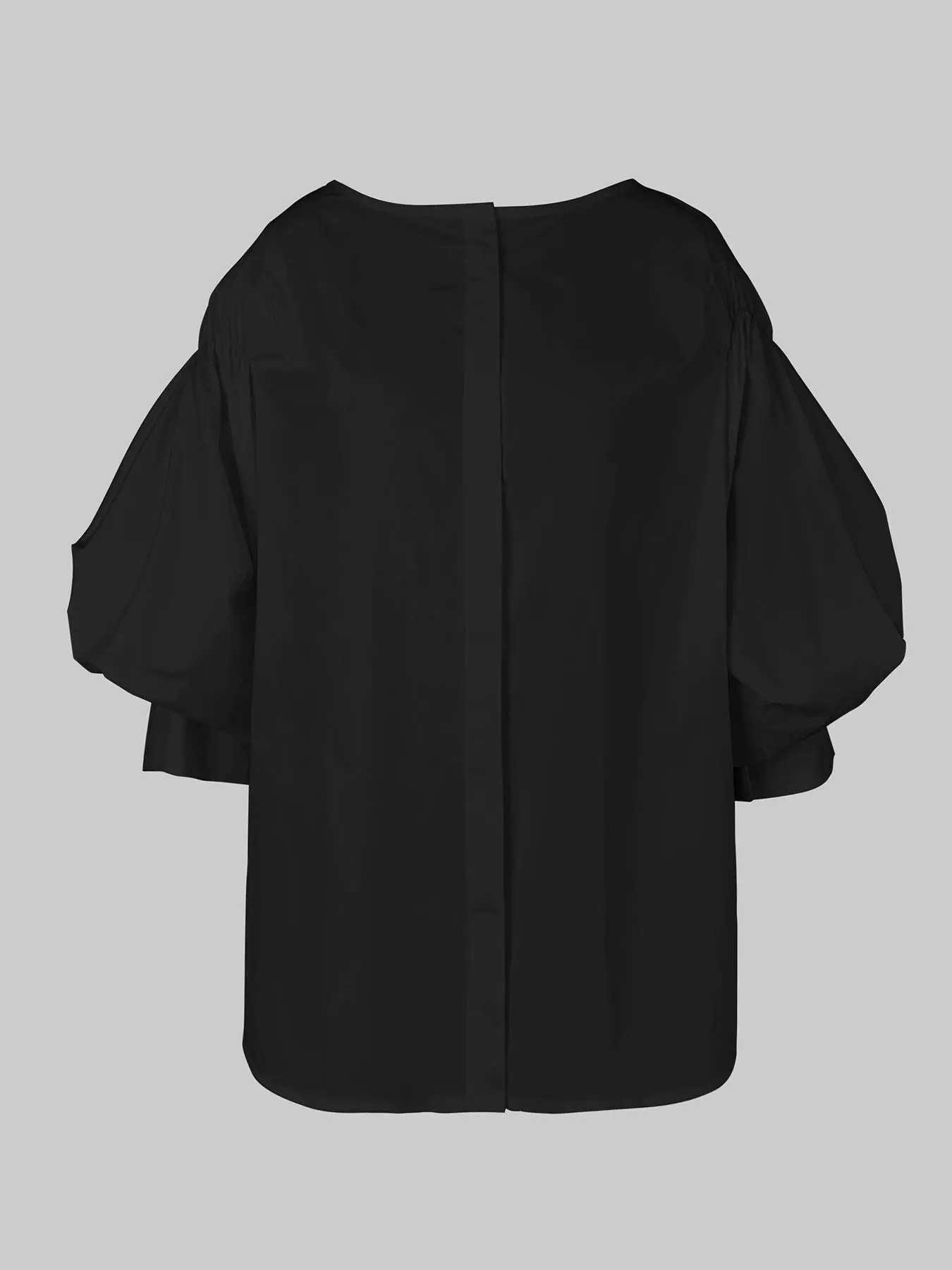 Design element is fabulous. Keg of mutton sleeves are the showstopper. Boat neck, easy fit throygh bodice. Hidden front button. Hugs just around belly button. Perfect for side tuck or full overlay. Fabrication is poly/elastain. Easy care abd wear however I would have preferred crisp cotton fabric