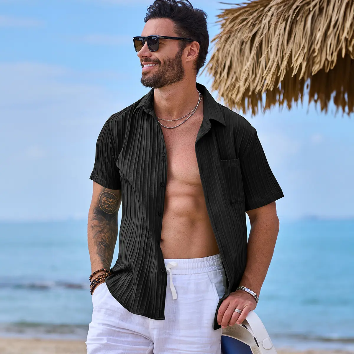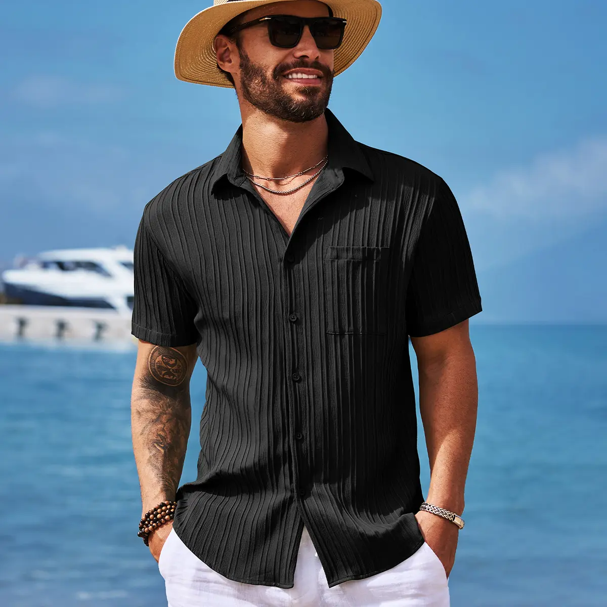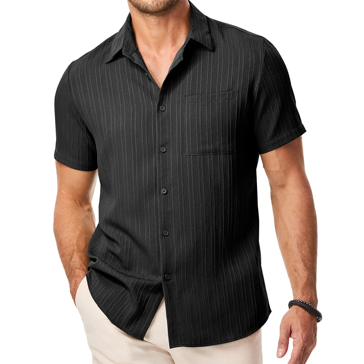 【Stylish Textured Design】 This well-designed beach shirt for men features a regular fit, button down closure, and a classic solid color. The addition of textured design and a left chest pocket adds both a touch of style and functional convenience.
