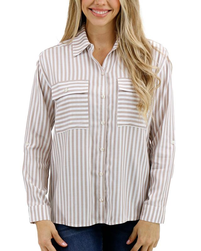 ·Classic long sleeved ivory and tan striped button down shirt with a true to size fit