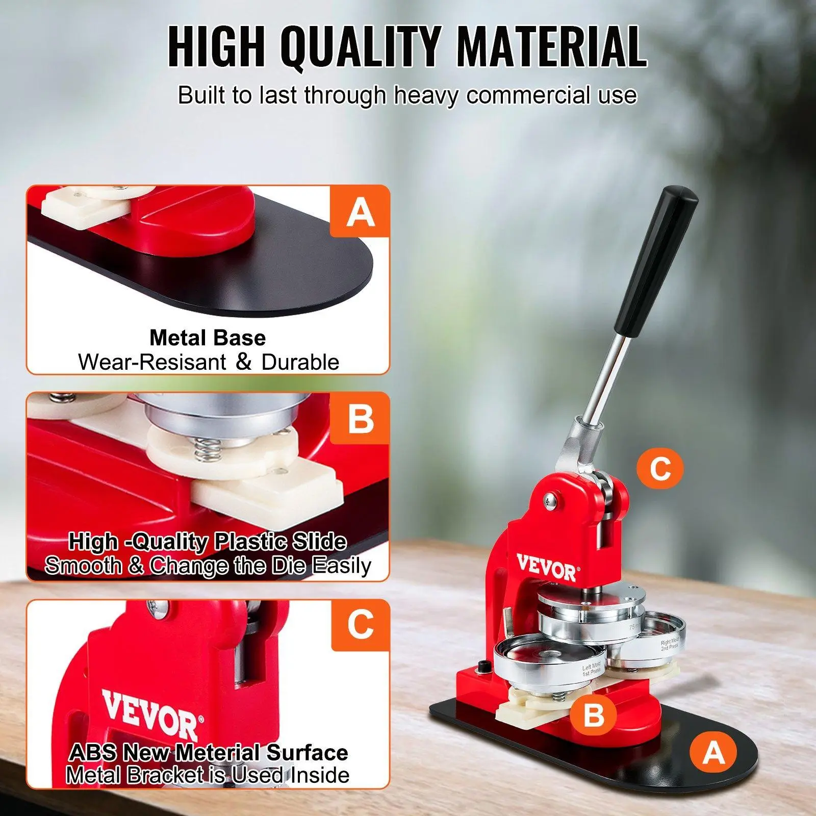 ·Crafted With High-quality Materials: The pin maker machine is made of high-quality iron, and the surface is ABS new material coated. It's sturdy and resistant to breaks. The solid bottom plate and upgrade rail can ensure long service life and elevate badge-making's success rate.