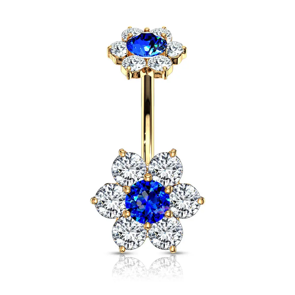 Gold Internally threaded flower belly button ring with dark blue gem center and clear gem petals. Both the bottom and top have the gorgeous flower for an all over sparkle and shine.