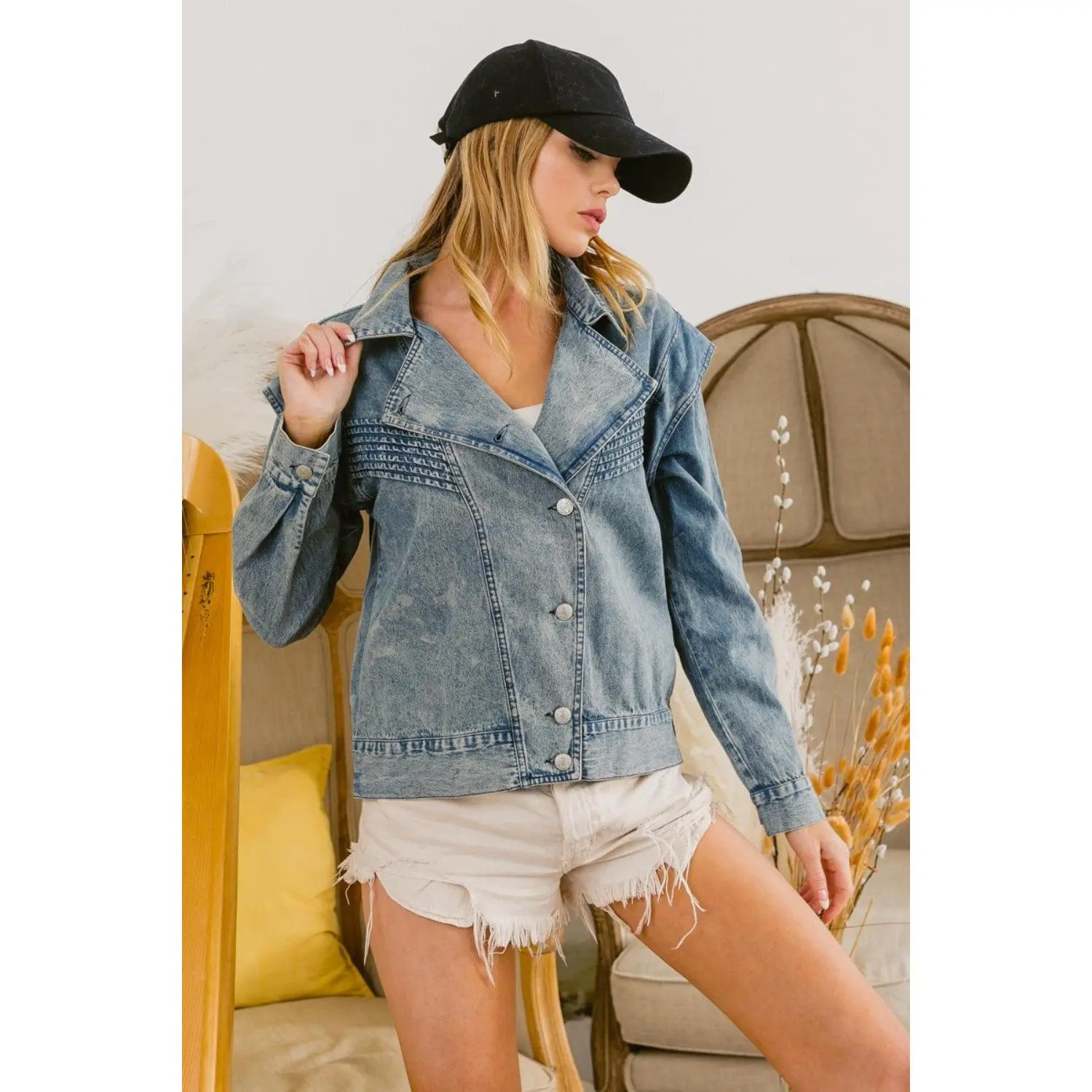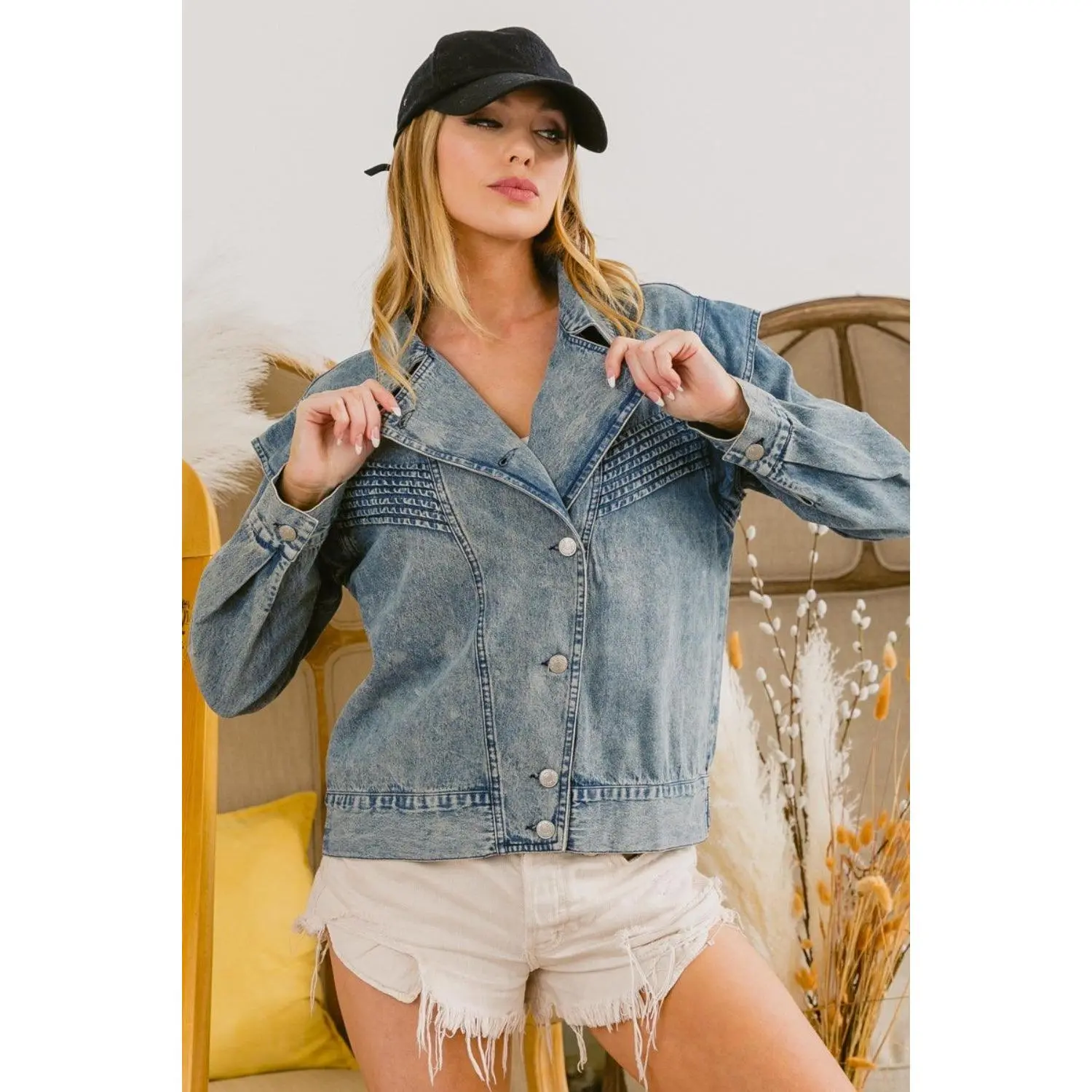 The Button Up Long Sleeve Denim Jacket is a timeless and versatile wardrobe staple. Made from durable denim fabric, it offers a classic and rugged look. With its button-up design and long sleeves, it provides warmth and coverage in cooler weather. The jacket features traditional details like a collar, front pockets, and buttoned cuffs, adding to its overall charm and functionality. It can be easily styled with a variety of outfits, from casual jeans and a t-shirt to a bohemian dress. Whether worn as a layering piece or as a statement outerwear, the Button Up Long Sleeve Denim Jacket is a must-have for adding a touch of effortless style to your look.