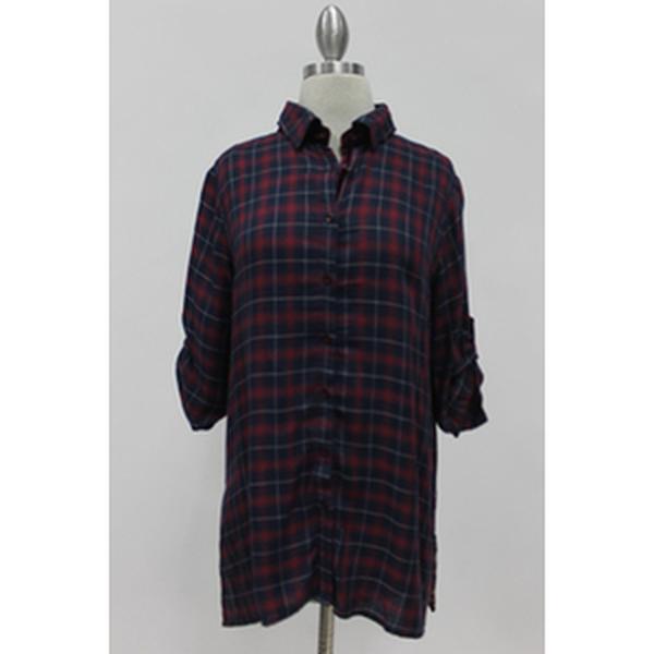 5. Button Up Plaid Quarter Sleeve Top - Navy/Burgundy - Curvy