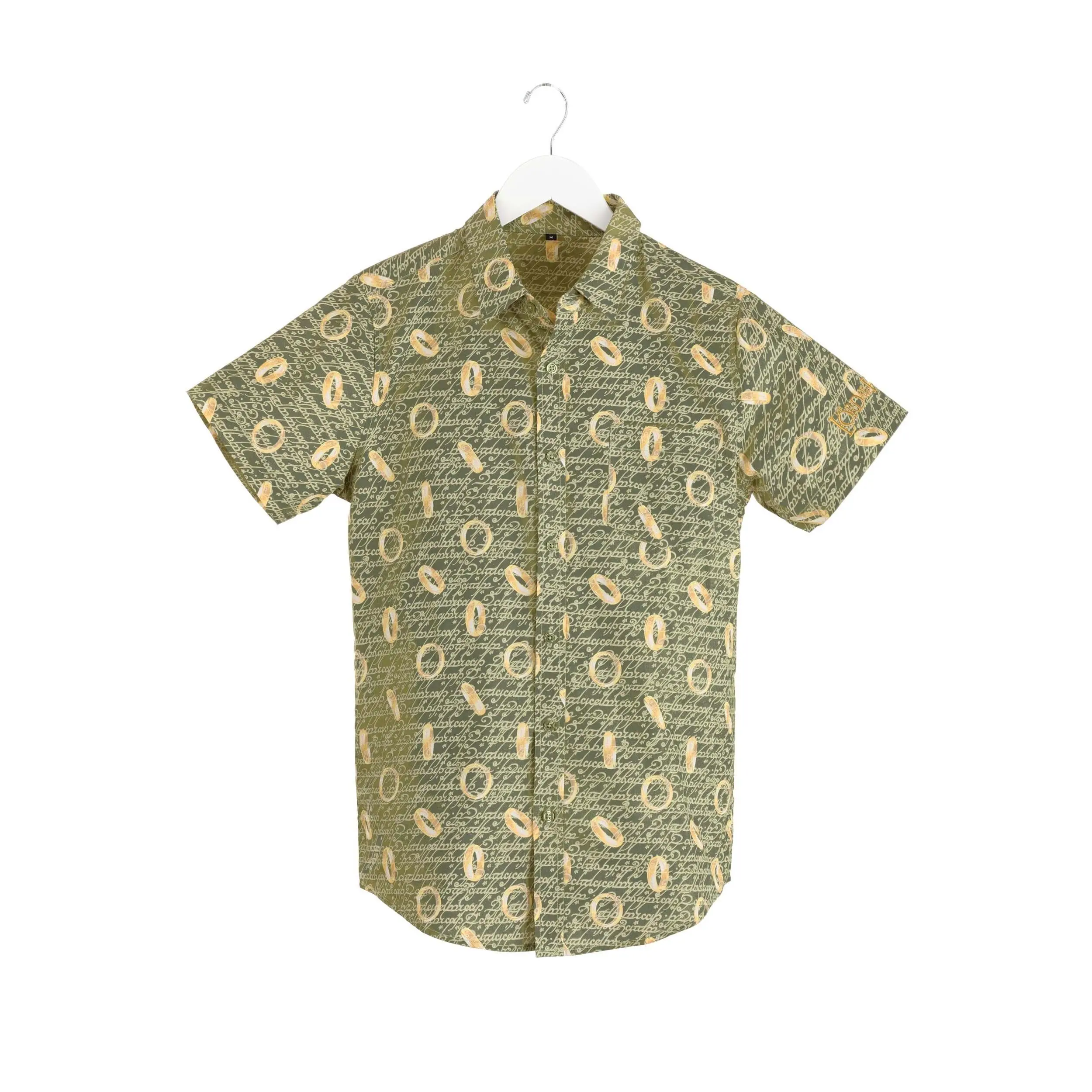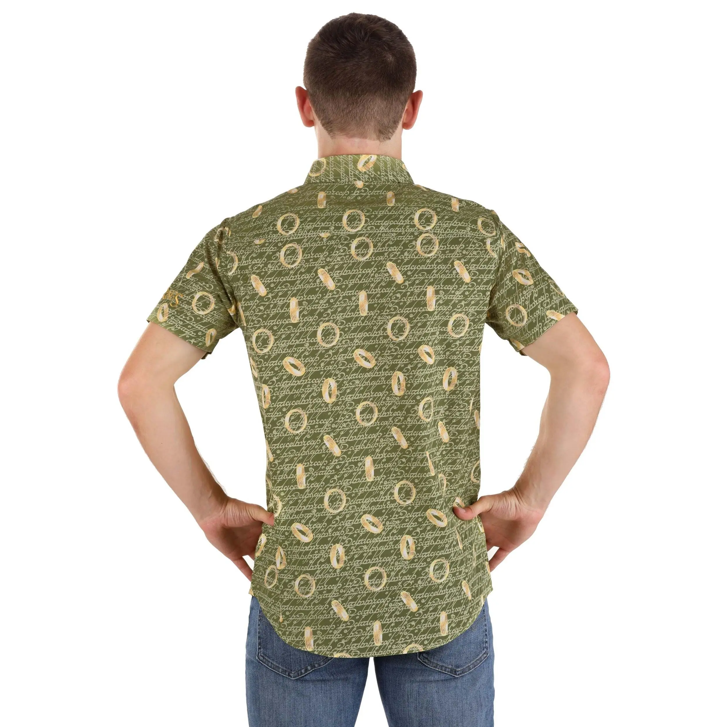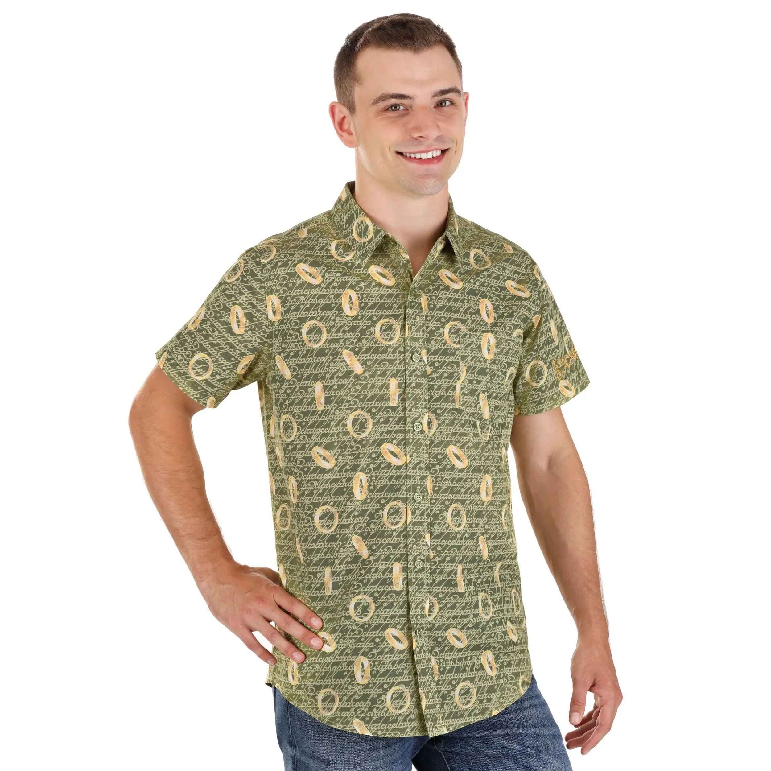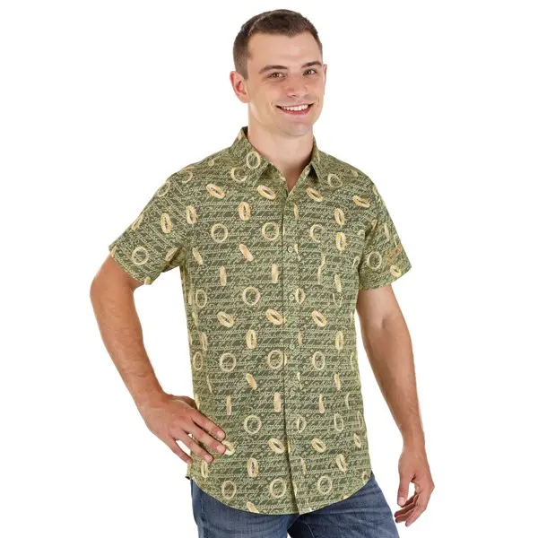 It is all thanks to The One Ring Button-Up Shirt. This officially licensed Lord of the Rings shirt features a light green base with golden all-over print, creating both the repeated icon of the legendary Ring and the mystical language that reveals its secret. Should any wraiths happen to spot you with the real treasure, they'll be baffled as can be. (Just let them know they can pick up one, too, and Sauron will soon be more concerned with missing out on festive shirts than ruling Middle-Earth.)