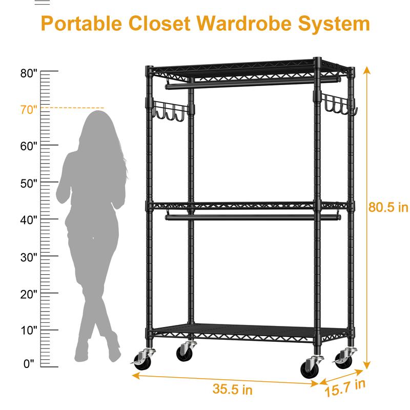 【Buy 1 Get 1 Free】Heavy-Duty Rolling Clothes Rack P1 Portable Wardrobe with Wheels for Hanging Clothes Organiser,Hold 500lbs Hangable Black Closet Storage System Adjustable Standing Shelf Folding Trolley Cart