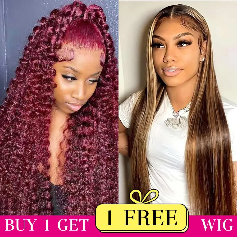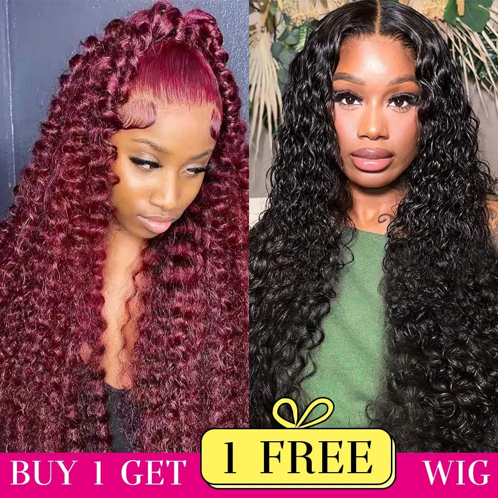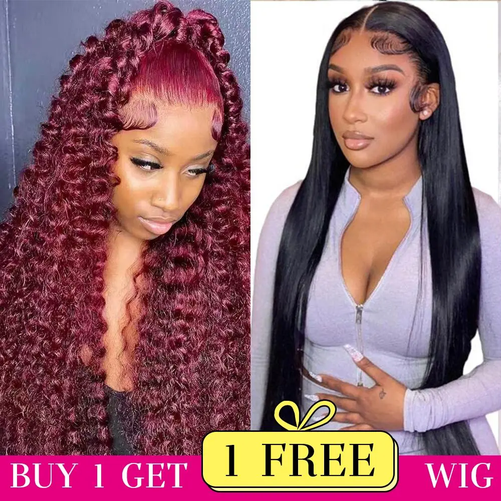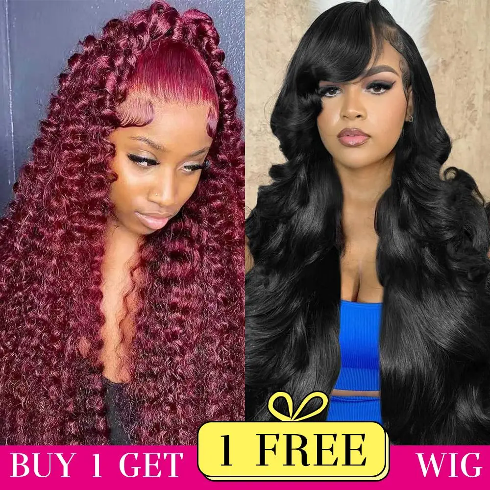 [Combo sale 26"&26"] buy 1 get 2 wig" 26Inch 13x4 Jerry Curly 99J Hair Lace Front Wigs + 13x4 26lnch Body waveHuman Hair Hair Pre Plucked HD Transparent Lace FrontalHuman Hair Wigs180% Density Black Fabric Hair Elastic