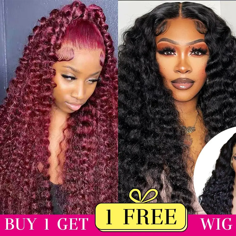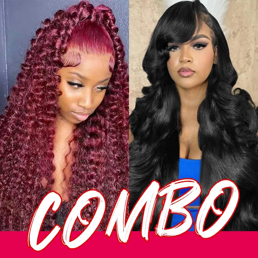 5. [Combo sale 26"&26"] buy 1 get 2 wig" 26Inch 13x4 Jerry Curly 99J Hair Lace Front Wigs + 13x4 26lnch Body waveHuman Hair Hair Pre Plucked HD Transparent Lace FrontalHuman Hair Wigs180% Density Black Fabric Hair Elastic