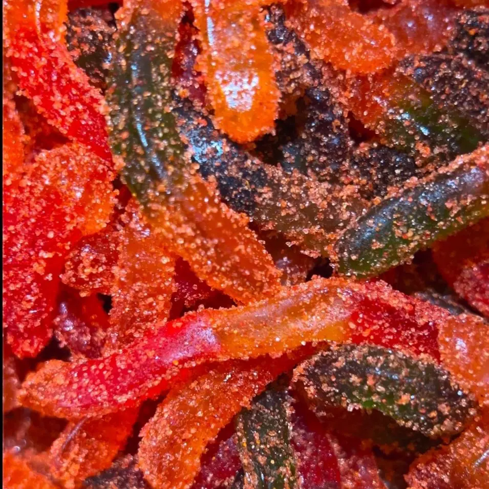 The new Doomsday Delight spicy mango Chamoy Caliente crawlers gummy worms in the fresh 6 ounce container for all ages. It’s
