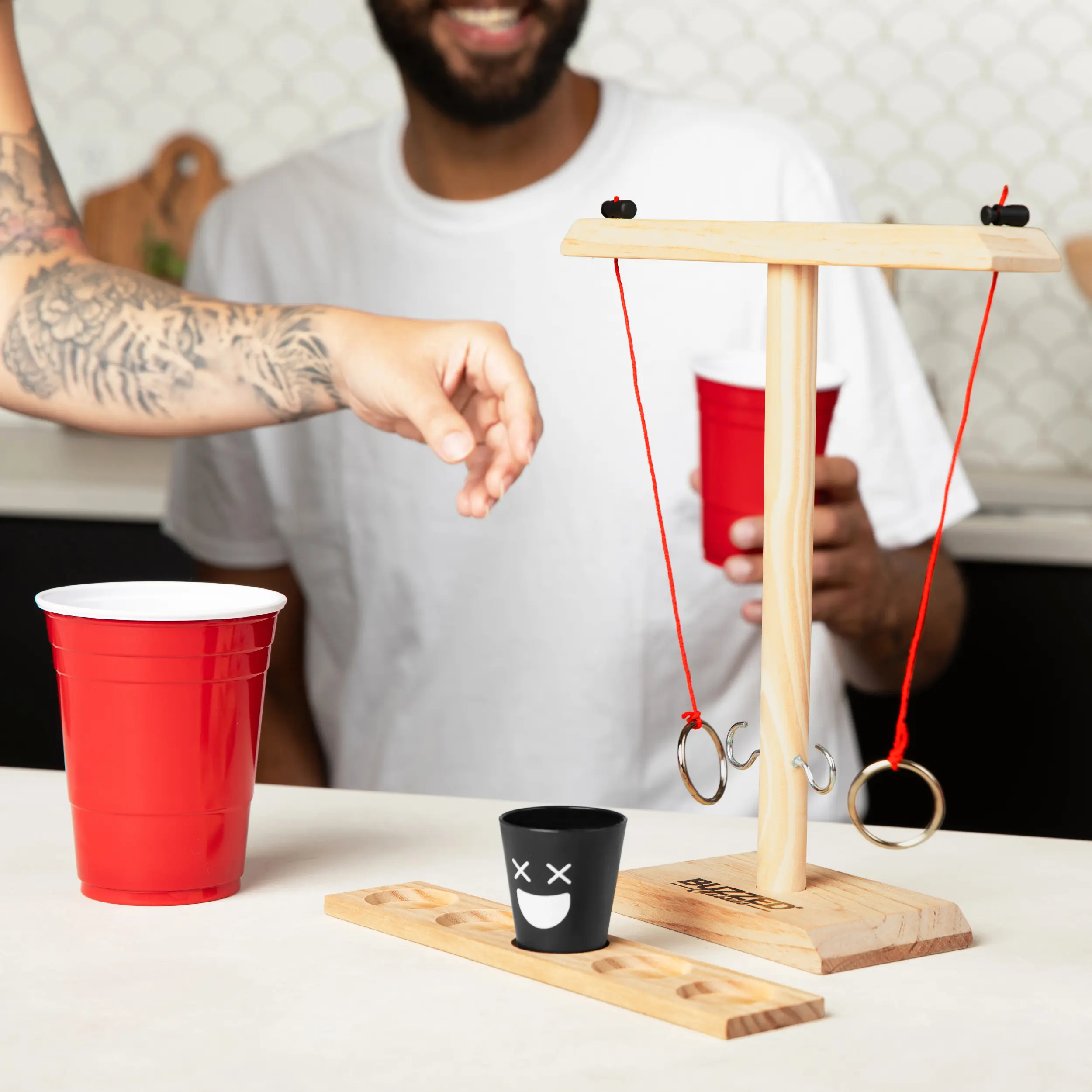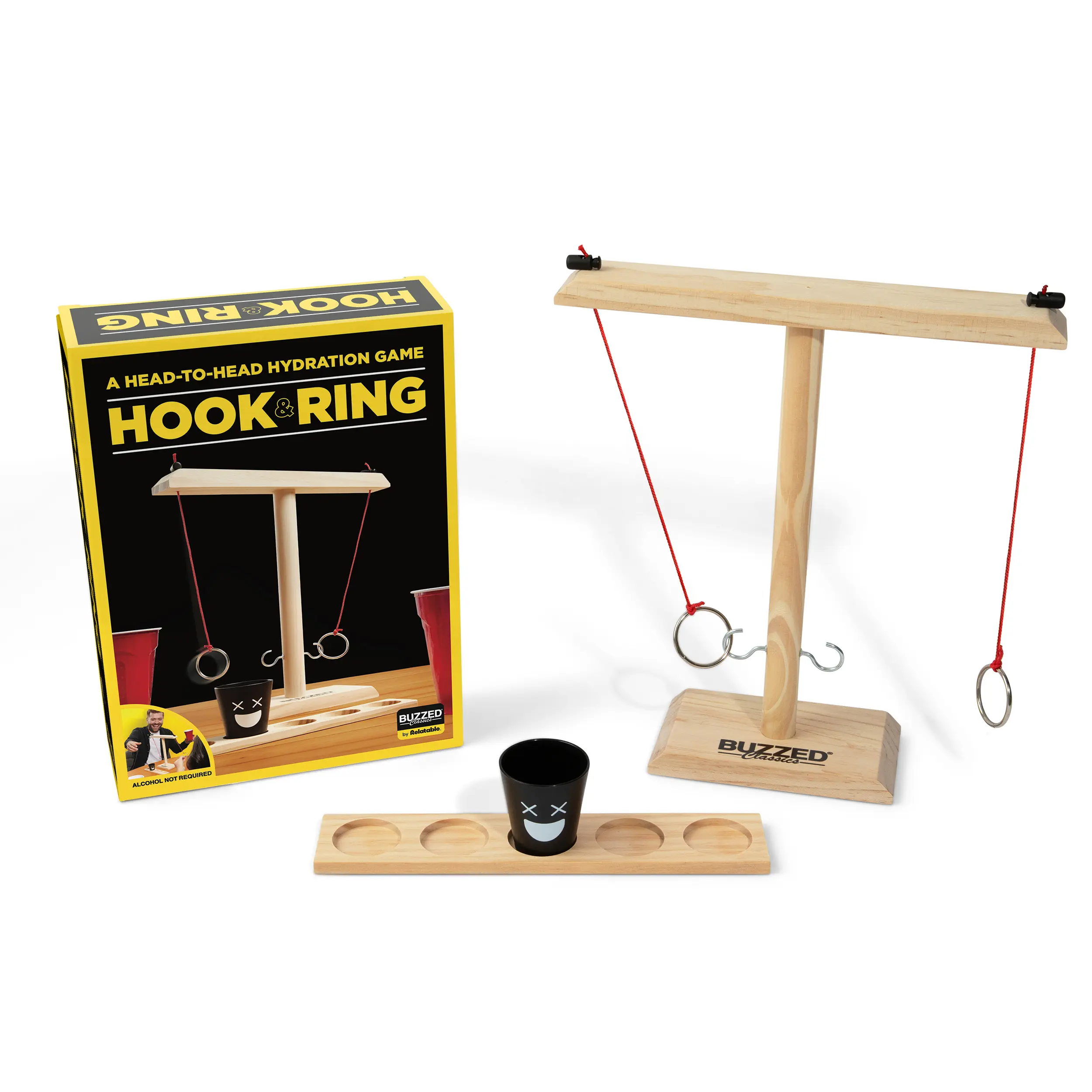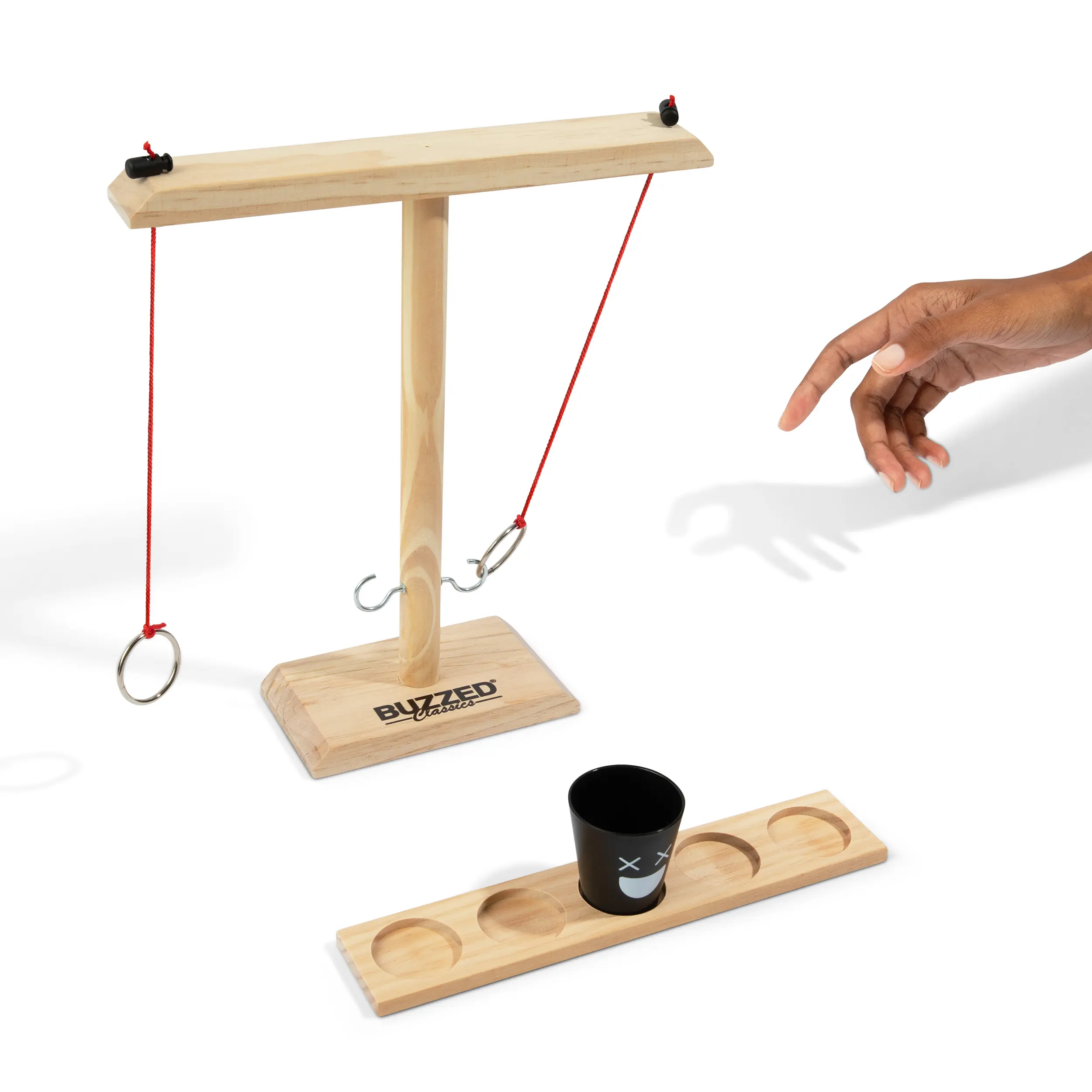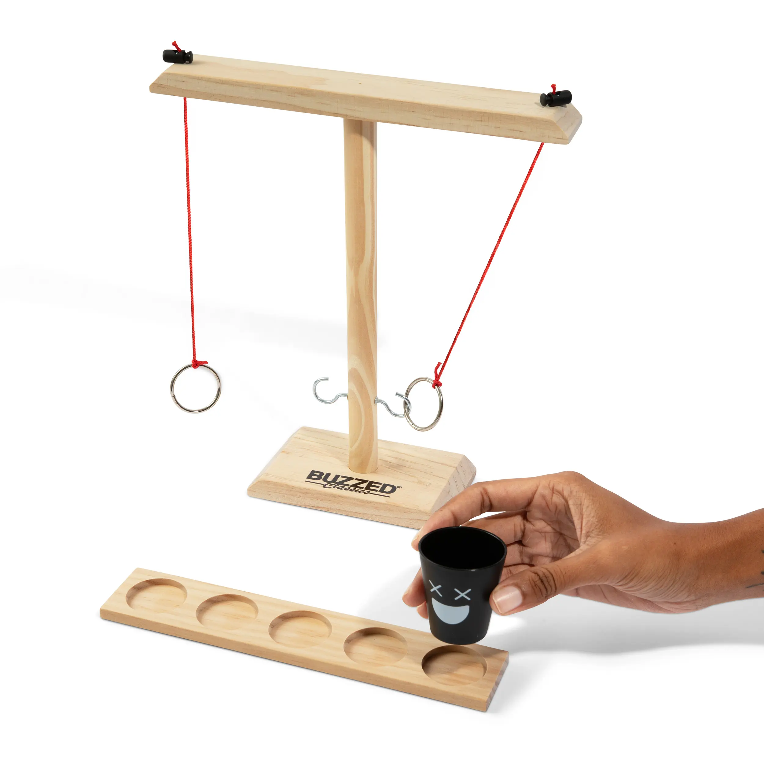If you like it, put a ring on it—and make your friends drink! Buzzed Hook & Ring is the ultimate party upgrade, bringing the classic bar ring toss game straight to your living room, backyard, or game night setup. Swing the ring, aim for the hook, and move the shot glass closer to your opponent with each successful toss. If it reaches their side… bottoms up!