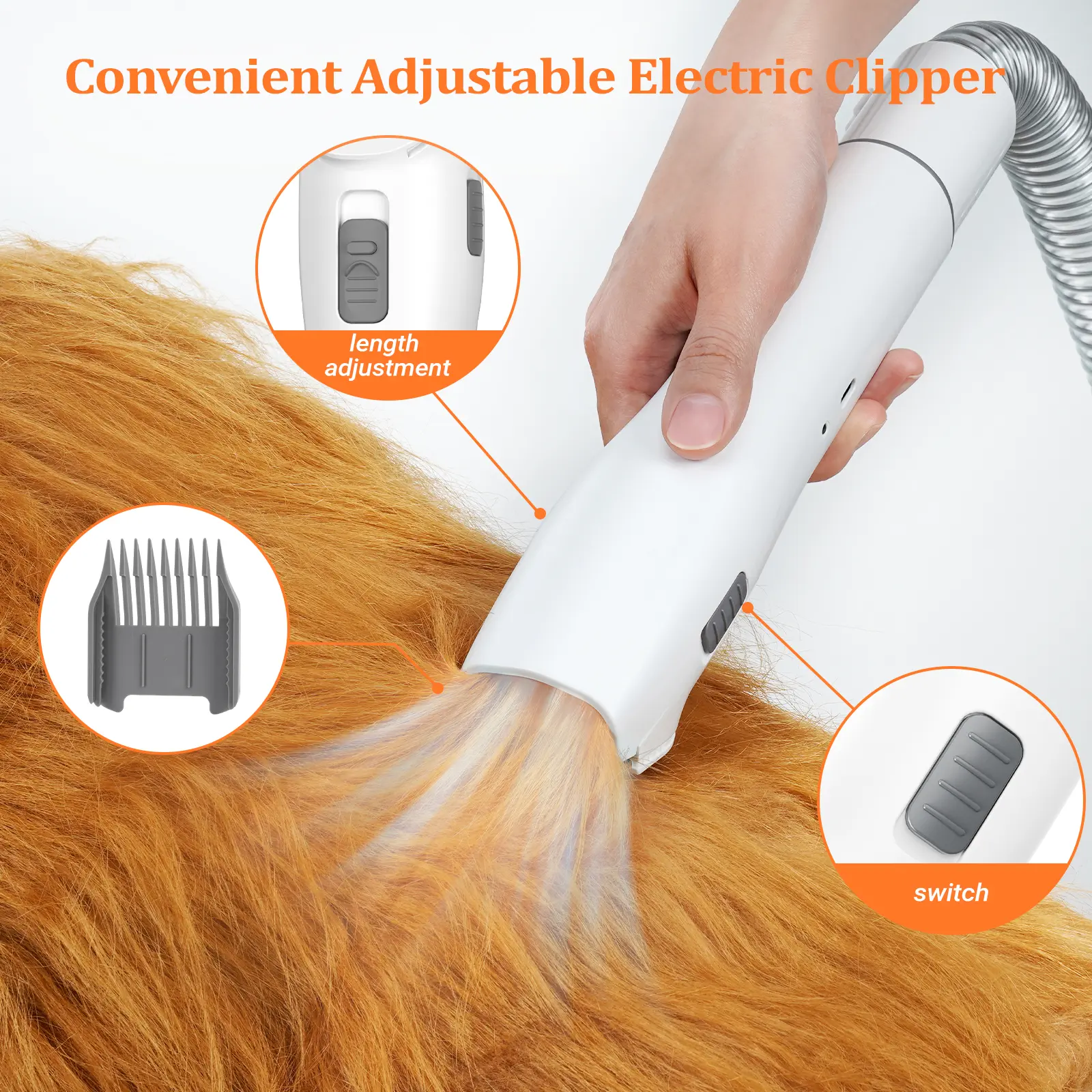 ·【Low Noise Design】Our dog vacuum for shedding grooming have undergone special noise reduction treatment, with a noise level below 60 dB. And there are 2 adjustable suction levels to choose from. We suggest massaging and feeding your pet before trimming their hair, so that your dog won't feel scared when grooming.