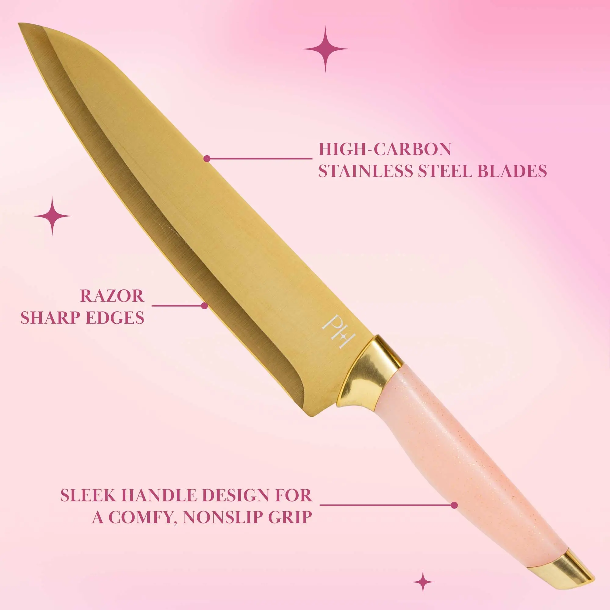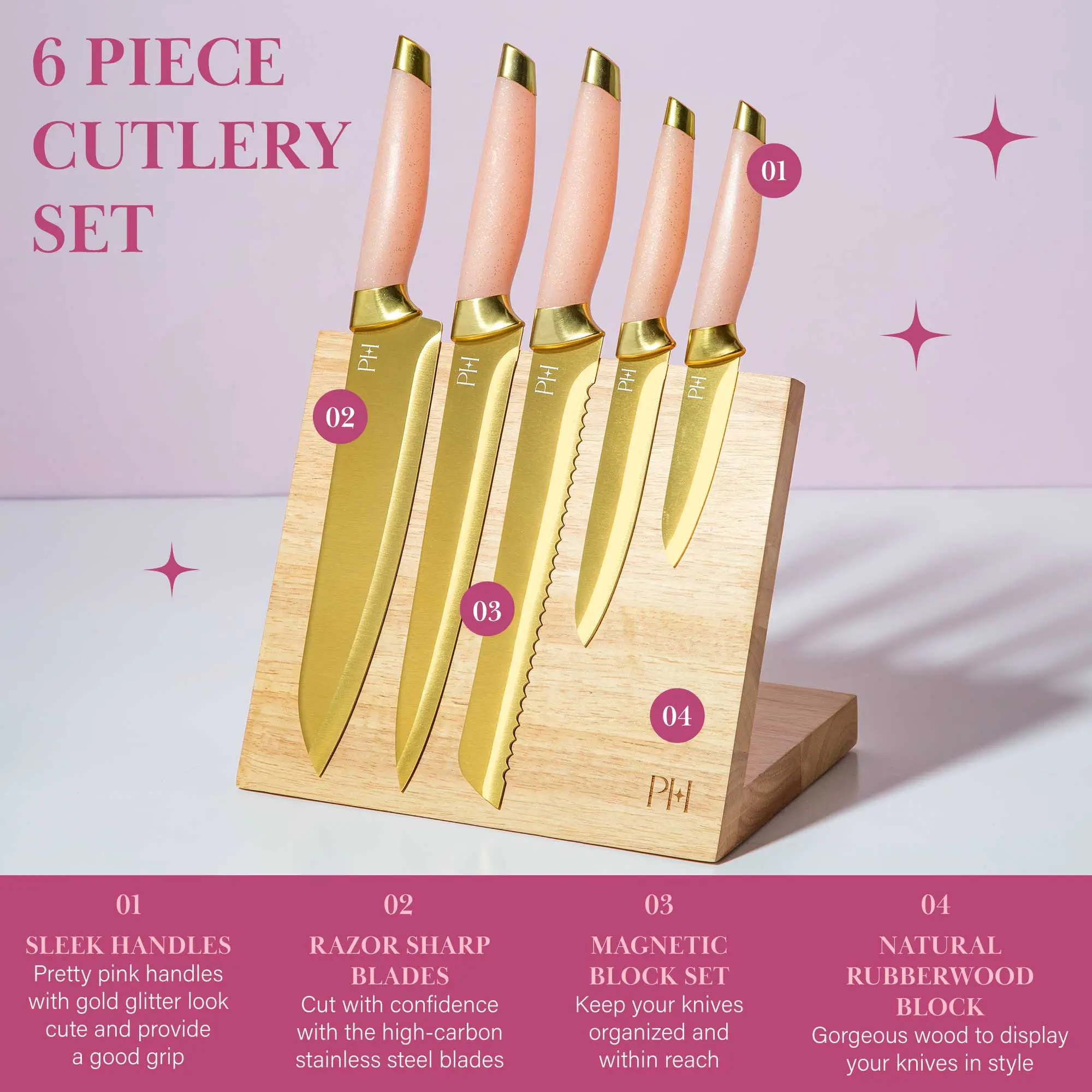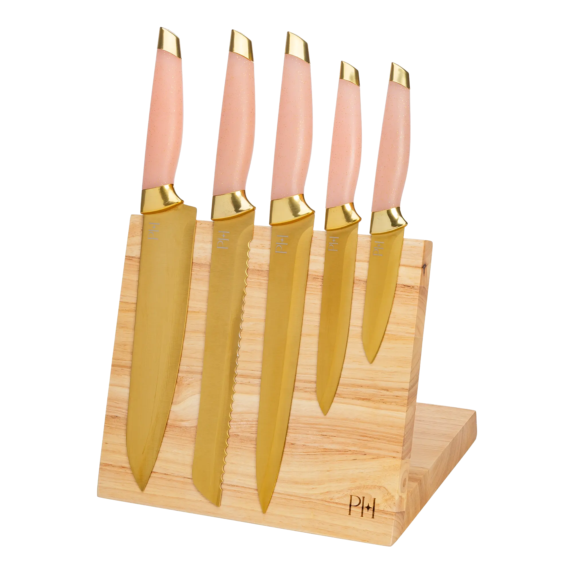 SLIV AND SLICE: This pink knife set with magnetic block includes a magnetic knife block and 5 knives: a 3.5-inch paring knife, a 5-inch utility knife, an 8-inch chef's knife, an 8-inch bread knife, and an 8-inch slicing knife.
