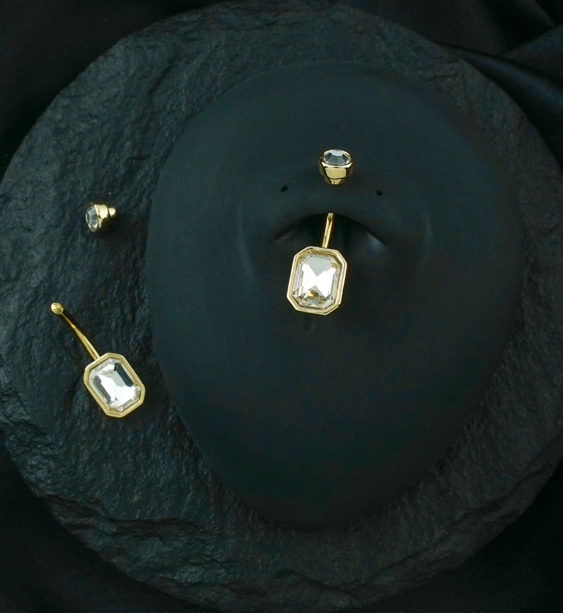 No more boring belly buttons with our Octet CZ Gold Belly Ring! Sold individually, this 14G, 7/16" (11mm) barbell features gold PVD on 316L stainless steel and clear CZ gems, one of which is in a baguette/rectangle shape. Top gem measures 5mm while the bottom has a 10mm x 8mm design. Perfect for healed piercings.