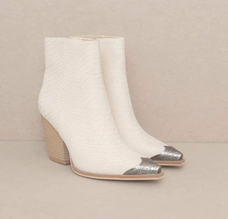 The perfect western bootie with an etched metal toe. Elegant and comfortable, this bootie is the perfect accent to any outfit. Shaft Height: 5" Heel Height: 3.5" Types of closures: Zipper Circumference of shoe opening:10.75" Shaft circumference:11"