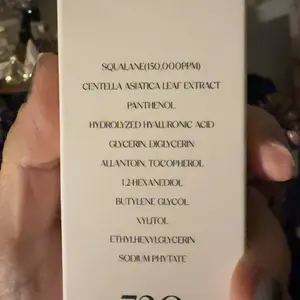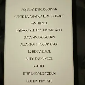 Ingredients Water, Squalane(150,000ppm), Glycerin, 1,2-Hexanediol, Diglycerin, Tapioca Starch, Hydrolyzed Hyaluronic Acid, Xylitol, Centella Asiatica Leaf Extract(1ppm), Ammonium Acryloyldimethyltaurate/VP Copolymer, Panthenol(5,000ppm), Acrylates/C10-30 Alkyl Acrylate Crosspolymer, Aminomethyl Propanediol, Caprylyl Glycol, Hydroxyethyl Acrylate/Sodium Acryloyldimethyl Taurate Copolymer, Allantoin, Ethylhexylglycerin, Sodium Phytate, Sorbitan Isostearate, Butylene Glycol, Tocopherol