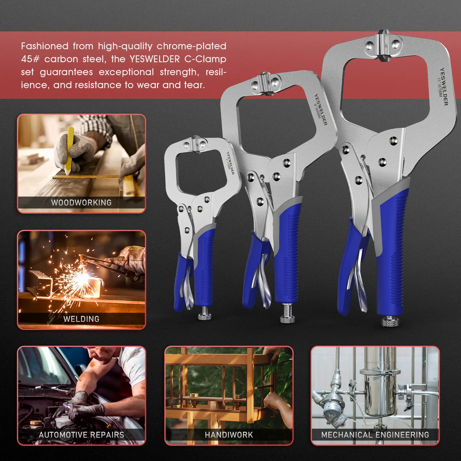 5. YESWELDER Locking C-Clamp Set of 3 Sizes (6, 9, 11 inches) | Robust Design, Heat-Treated Jaws, Chrome-Plated Alloy Steel | Home & Workshop Use
