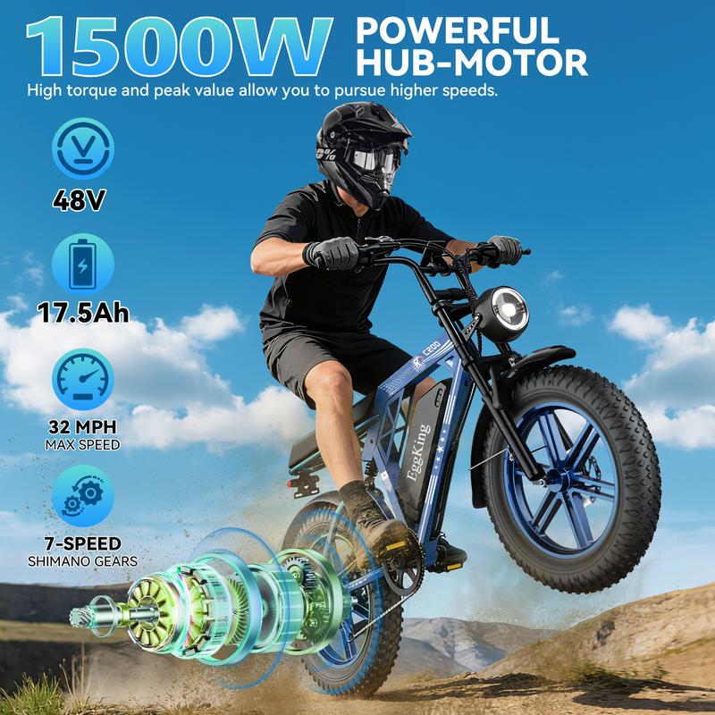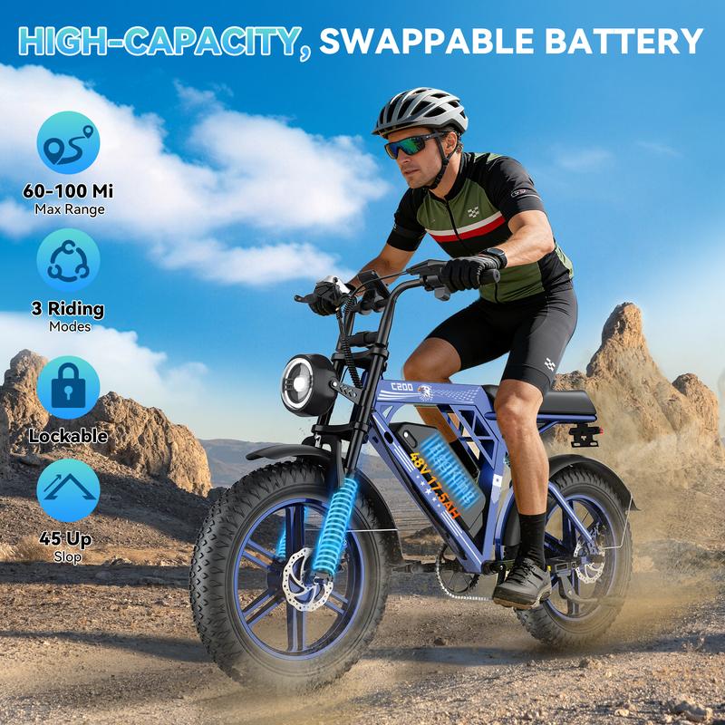 Discover the C200 Electric Ebike, powered by a 1500W motor, delivering up to 32MPH. Equipped with a 48V 17.5AH removable battery, this bike supports a maximum load of 150KG. The 20*4 inch off-road fat tires ensure rugged terrain capability. Perfect for adventurous riders, it offers a maximum mileage of 50-80KM. Rear-wheel drive and hydraulic brakes provide reliable performance.