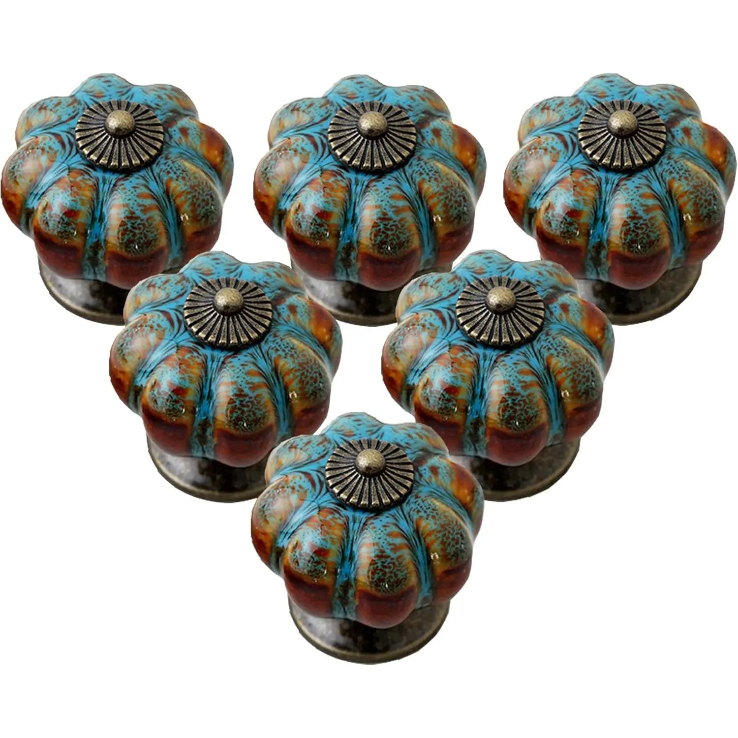 Cabinet Knobs 6 Pack Glazed Ceramic Knobs with Pumpkin Shape for Decor Door Pull Handle for Cabinet Drawers, Closets, Cupboard (Blue)