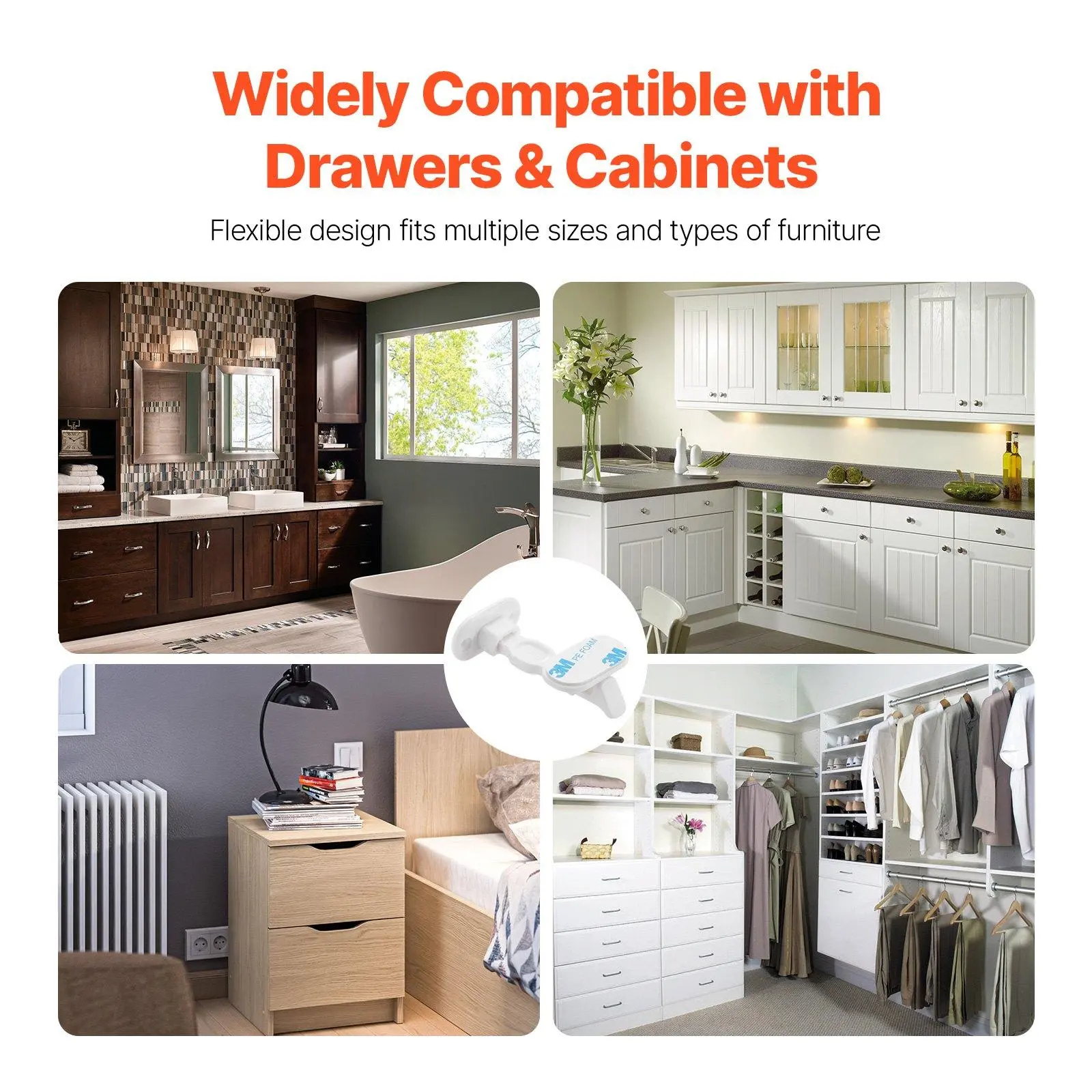 ·Widely Compatible: The adhesive cabinet latch easily fits most cabinets and drawers, providing security protection in the kitchen, bathroom, living room, bedroom, and more.