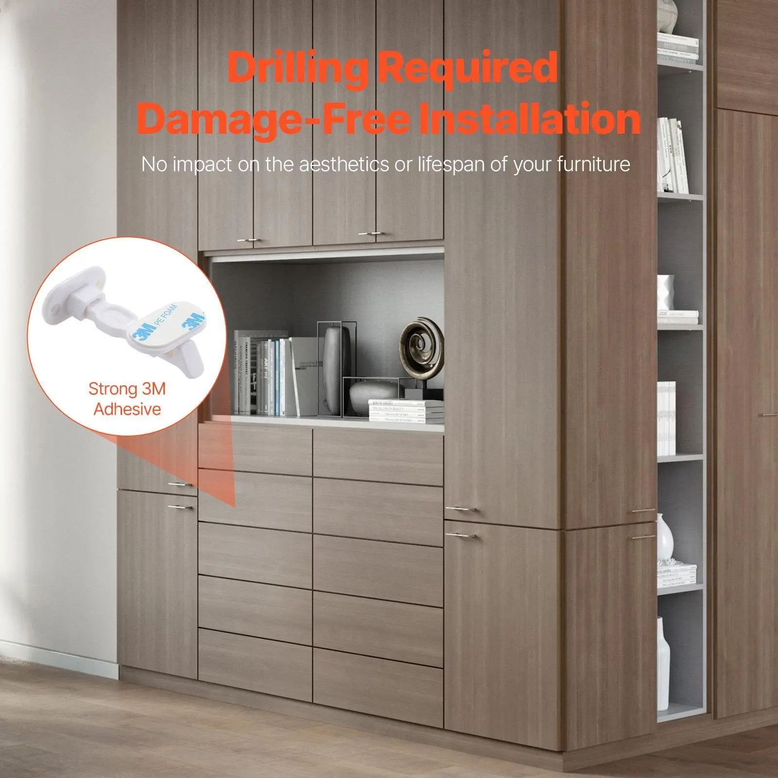 ·No-Drill Installation: Our child proof drawer locks are designed for tool-free installation, allowing for a firm fit without drilling into furniture. They preserve the integrity of furniture surfaces and extend their lifespan.