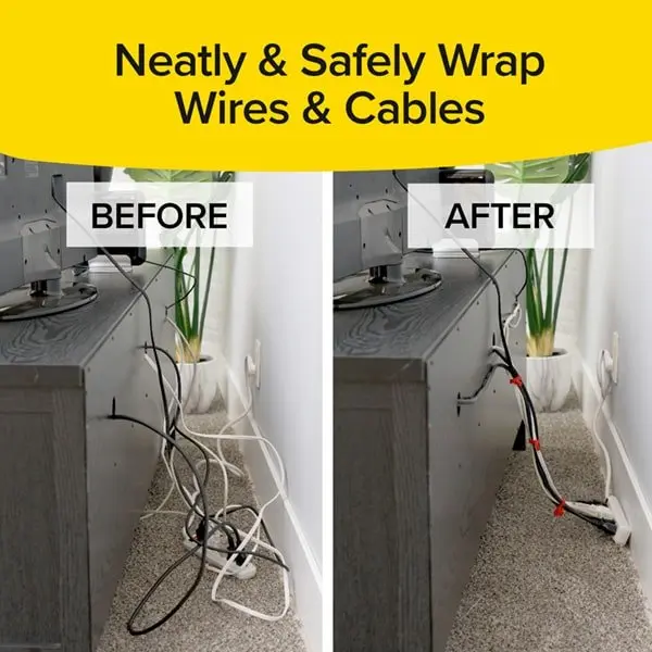 Those messy wires behind the TV neatly transform in seconds! You can even use Ruby Holding Hands to tie curtains back.