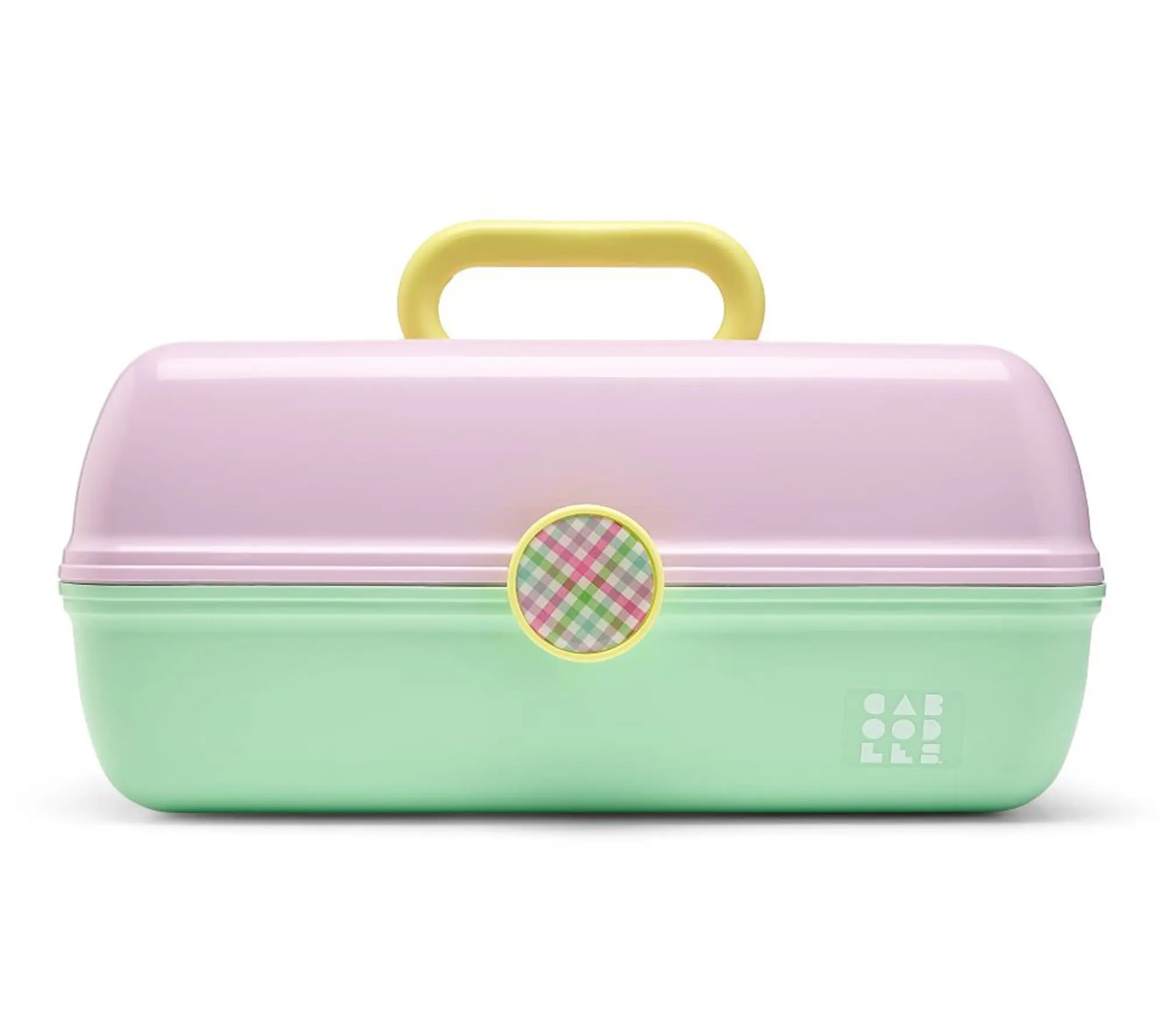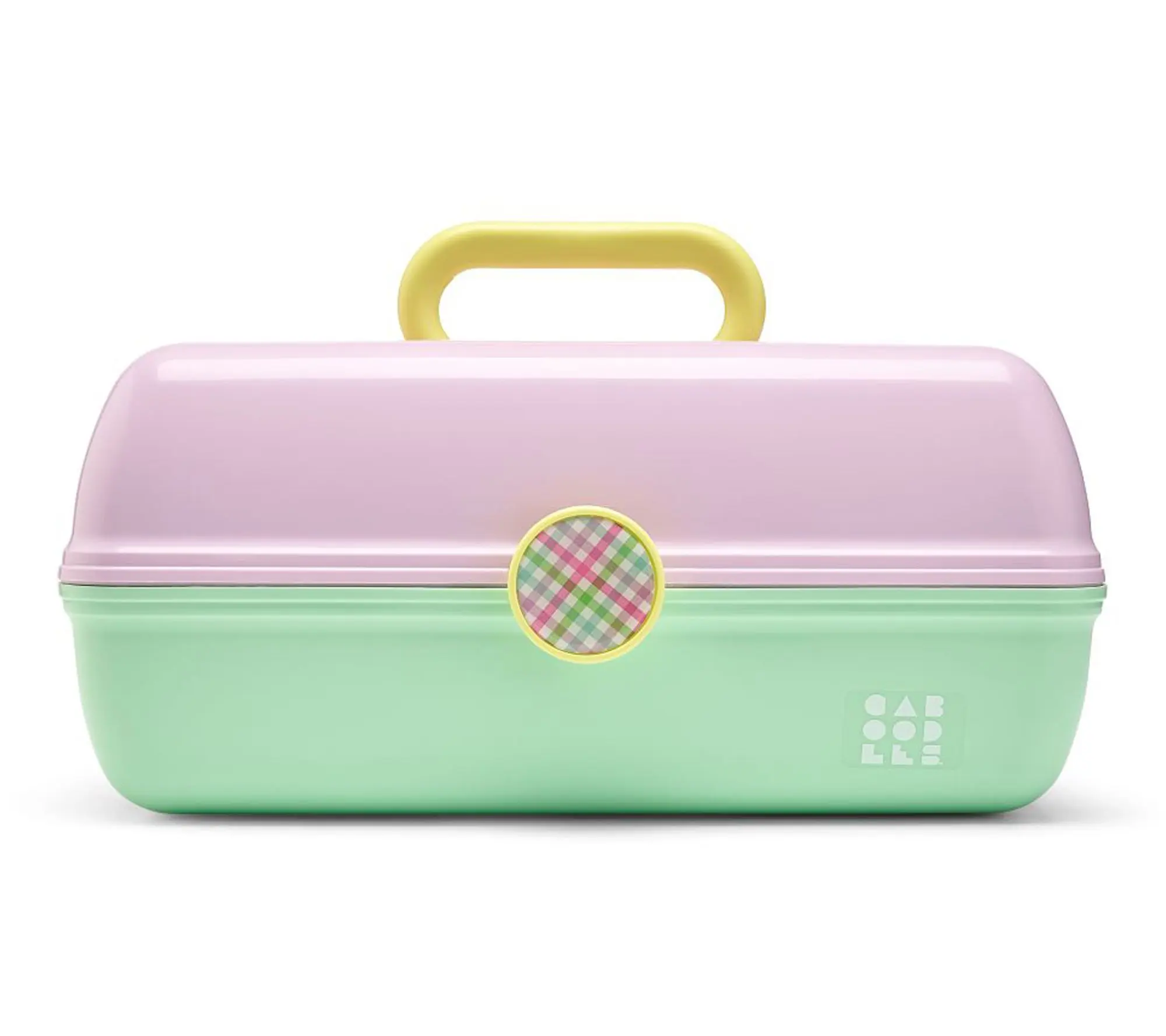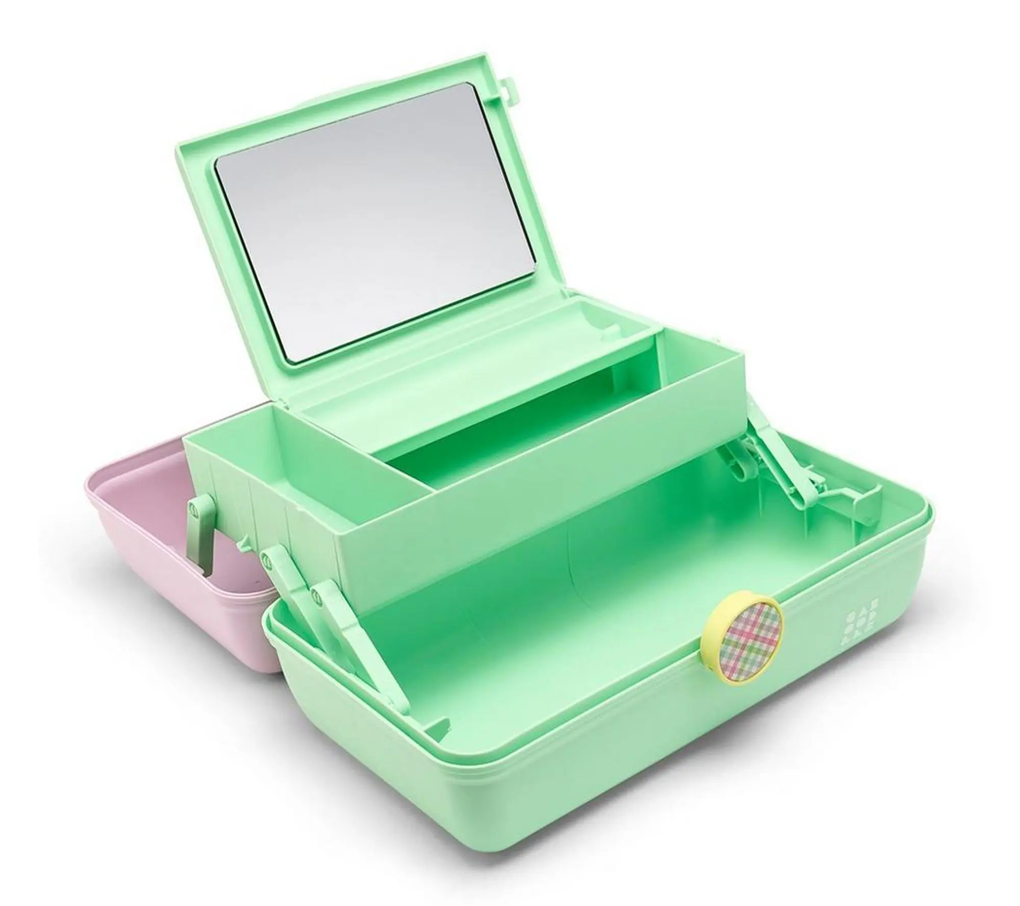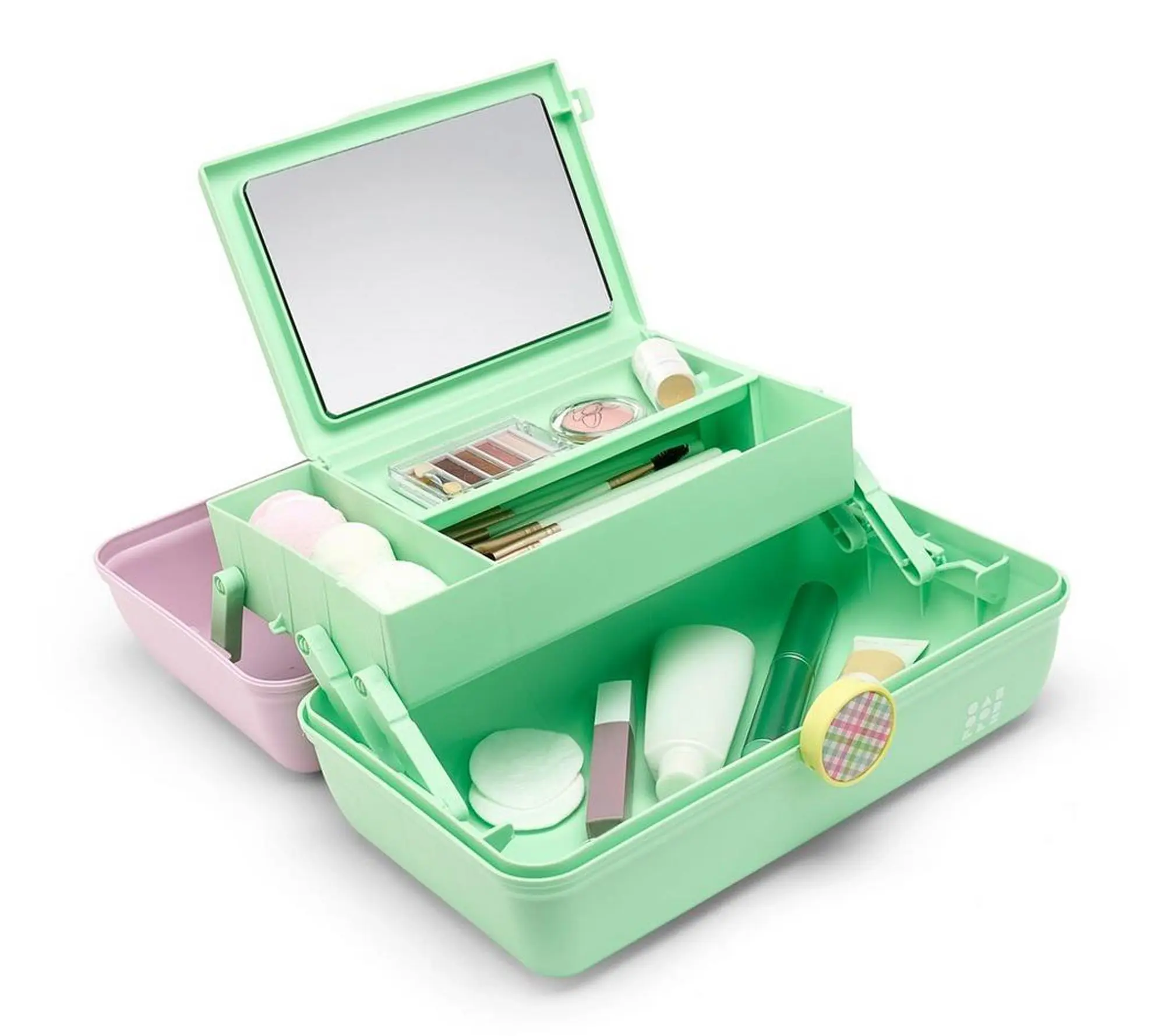 The iconic On-The-Go Girl case in a pastel color palette has a retro vibe and functional form. The top of the organizer features an auto-open tray, a flip lid and mirror, as well as a divided tray with three compartments for easy organization of your glam essentials. The bottom of the cosmetic case has abundant storage space to hold larger items like makeup palettes and brushes. A sturdy design and a secure latch make this case perfect to take on-the-go. From Caboodles.
