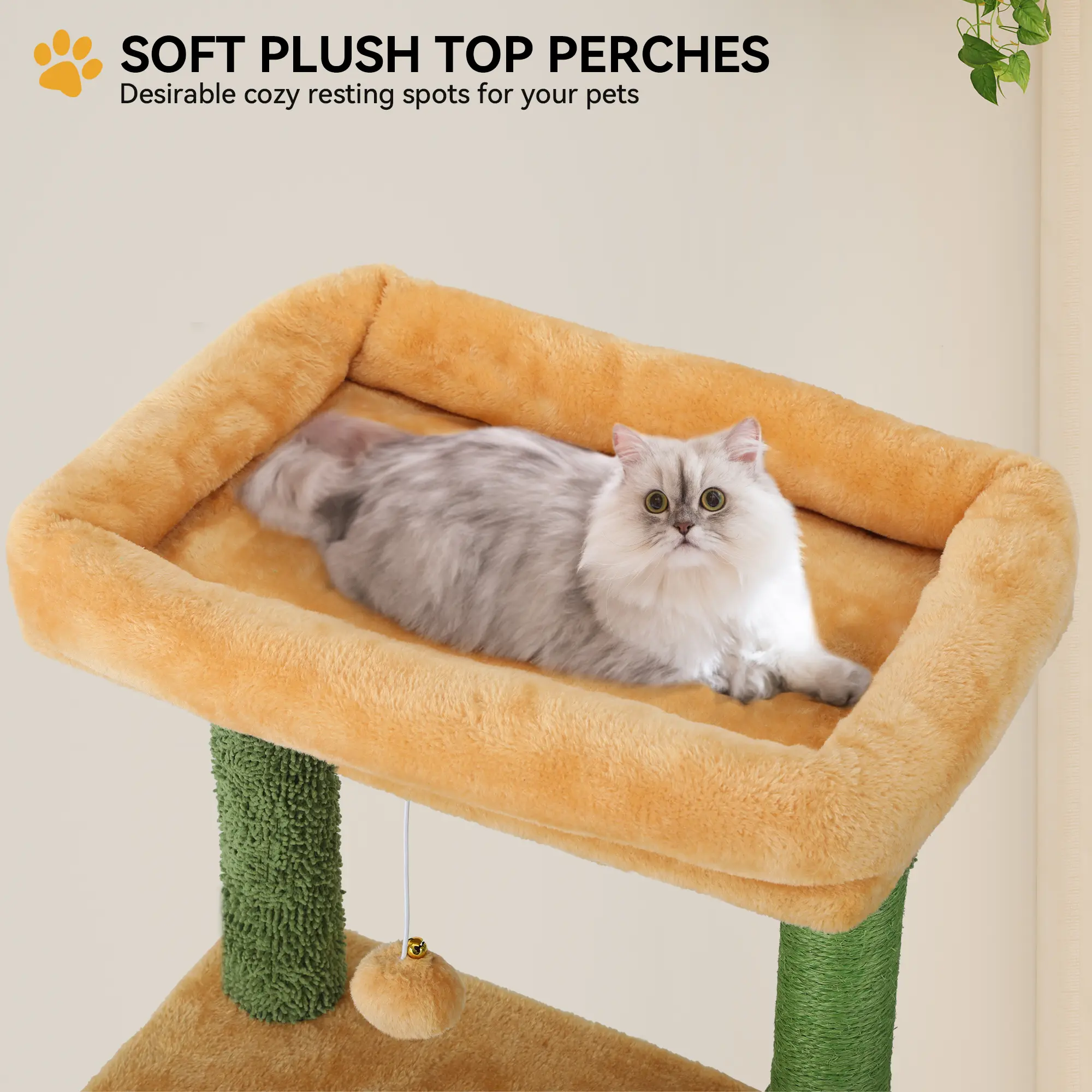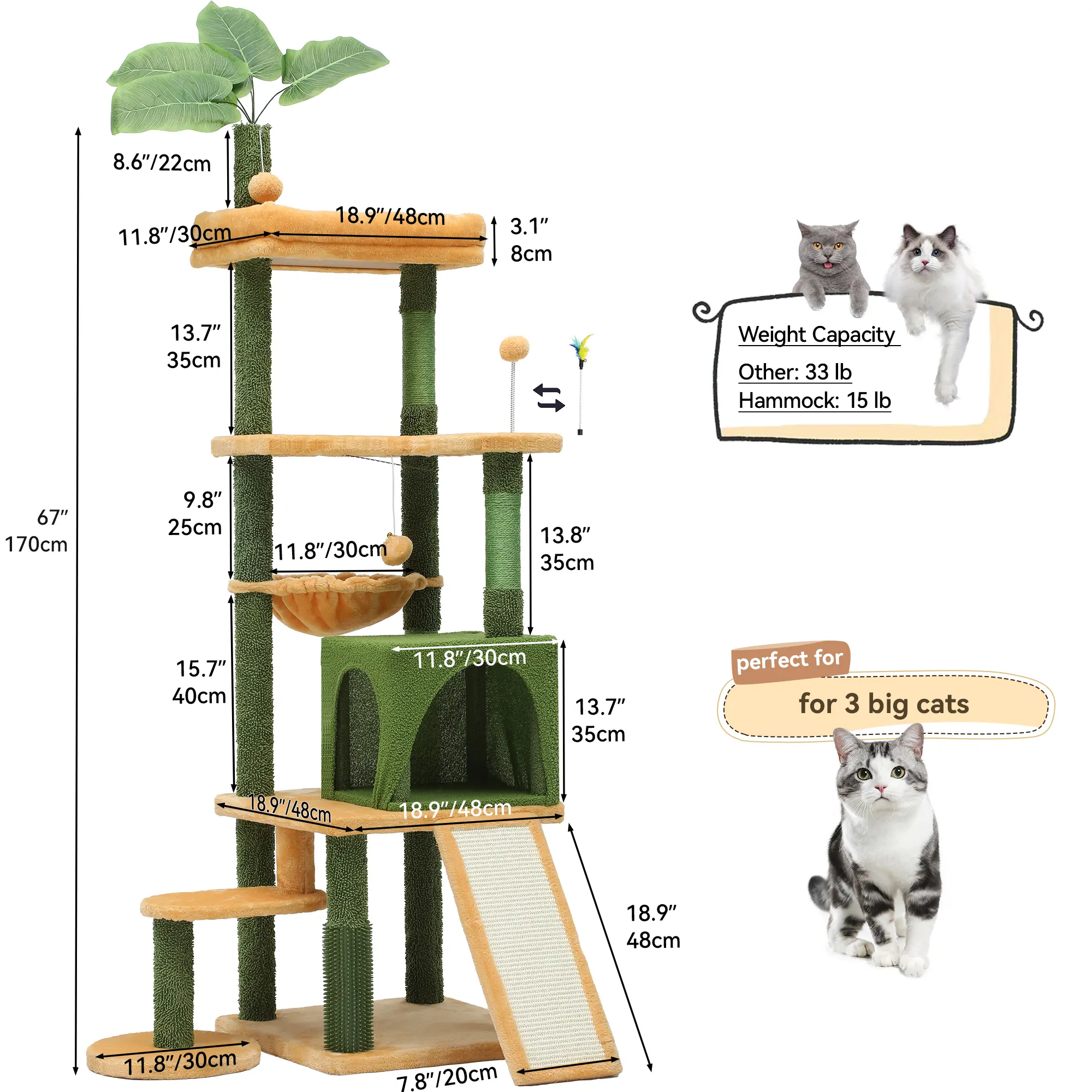 MULTI-LEVEL FUN: YITAHOME cactus cat tree is 153 cm tall and can accommodate multiple cats playing or resting at the same time. With ample space for activities, your kittens and adult cats can unleash their natural instincts to scratch, climb, play, exercise and sleep, stay content.TOTAL SIZE - 82 cm L x 74 cm W x 153 cm H , perfect for 3 cute cats in different ages to climb and play.