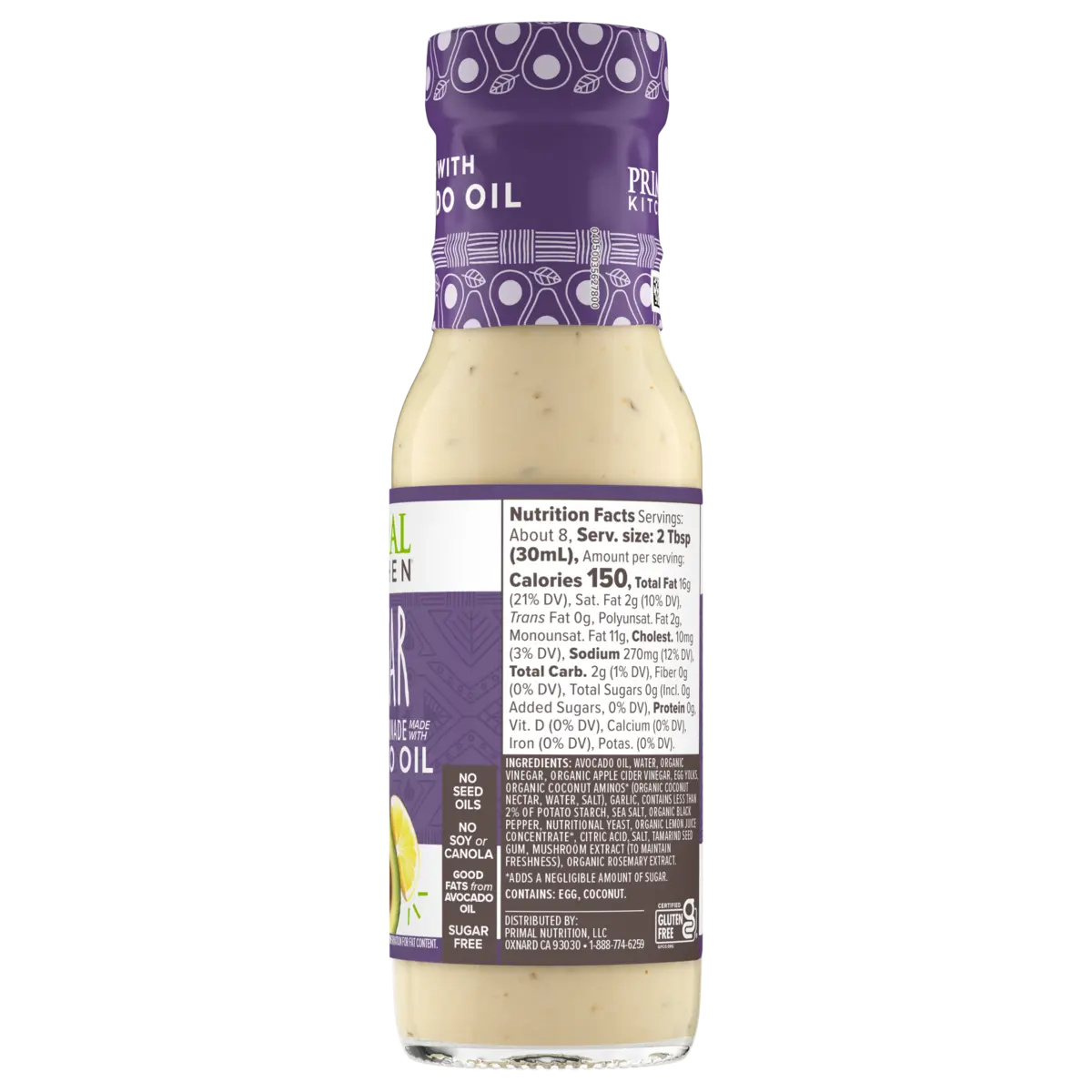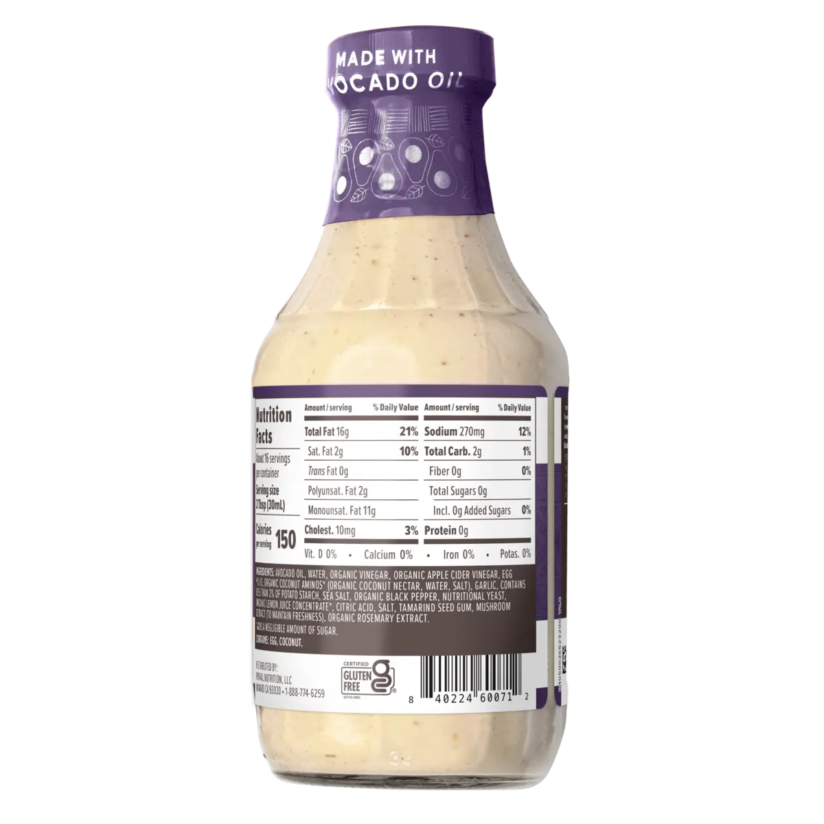 IngredientsAvocado Oil,Water,Organic Vinegar,Organic Apple Cider Vinegar,Organic Egg Yolks,Organic Coconut Aminos (Water & Organic Coconut Nectar & Salt),Garlic,Potato Starch,Sea Salt,Organic Black Pepper,Nutritional Yeast,Organic Lemon Juice Concentrate,Citric Acid,Salt,Tamarind Seed Gum,Mushroom Extract (To Maintain Freshness),Organic Rosemary Extract