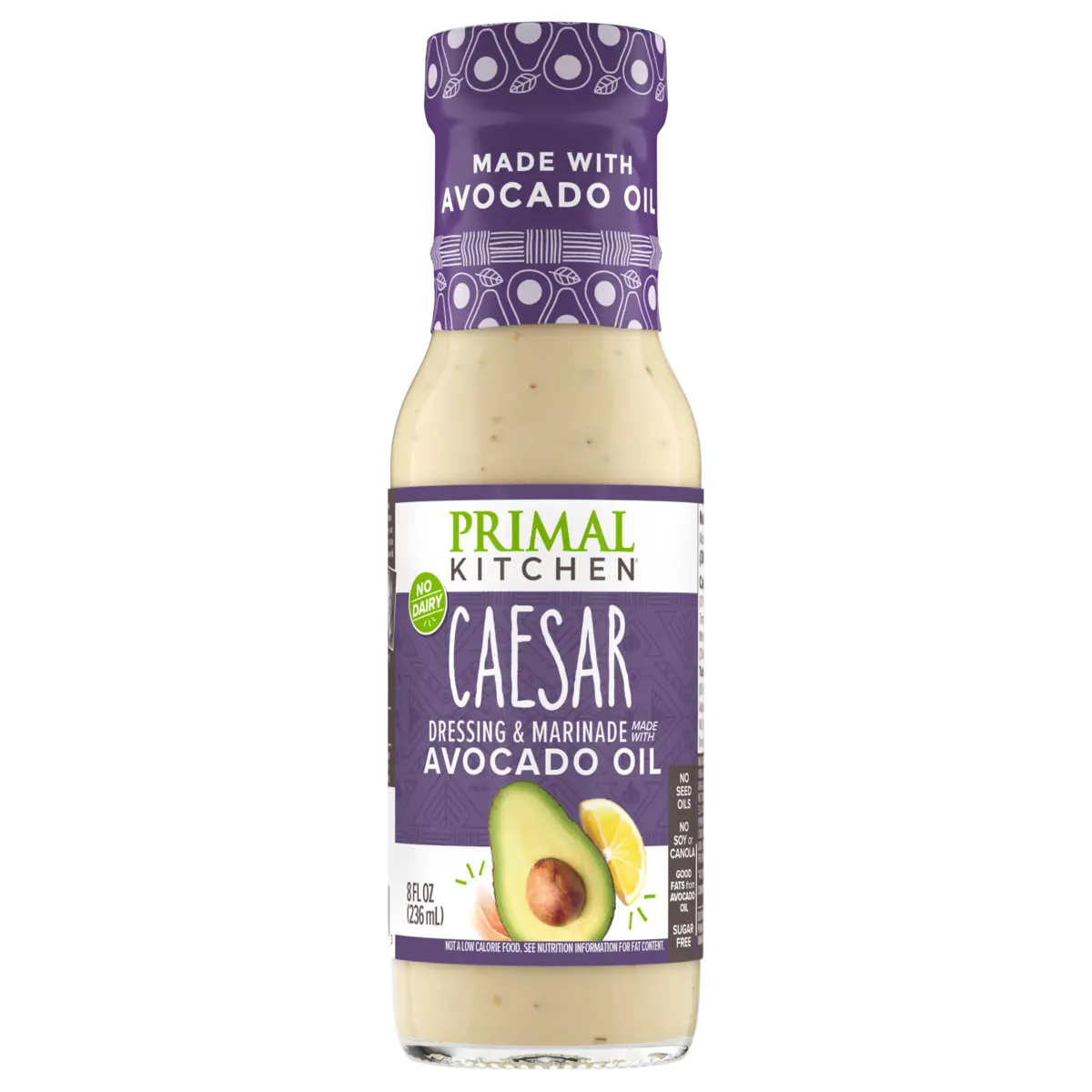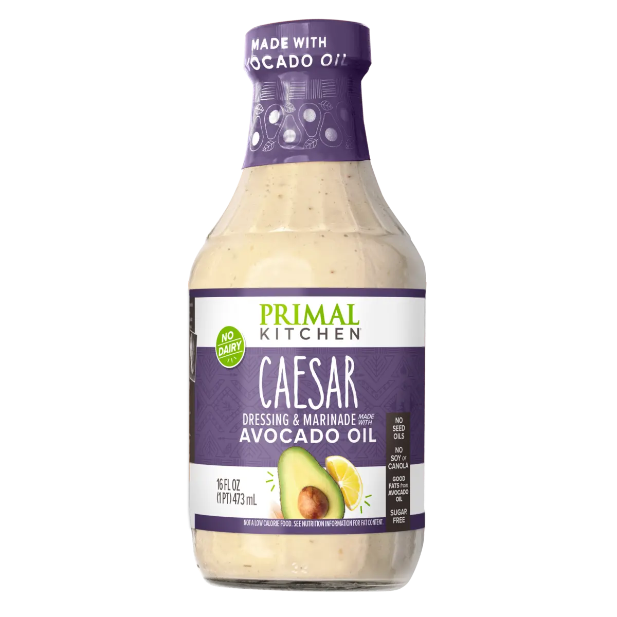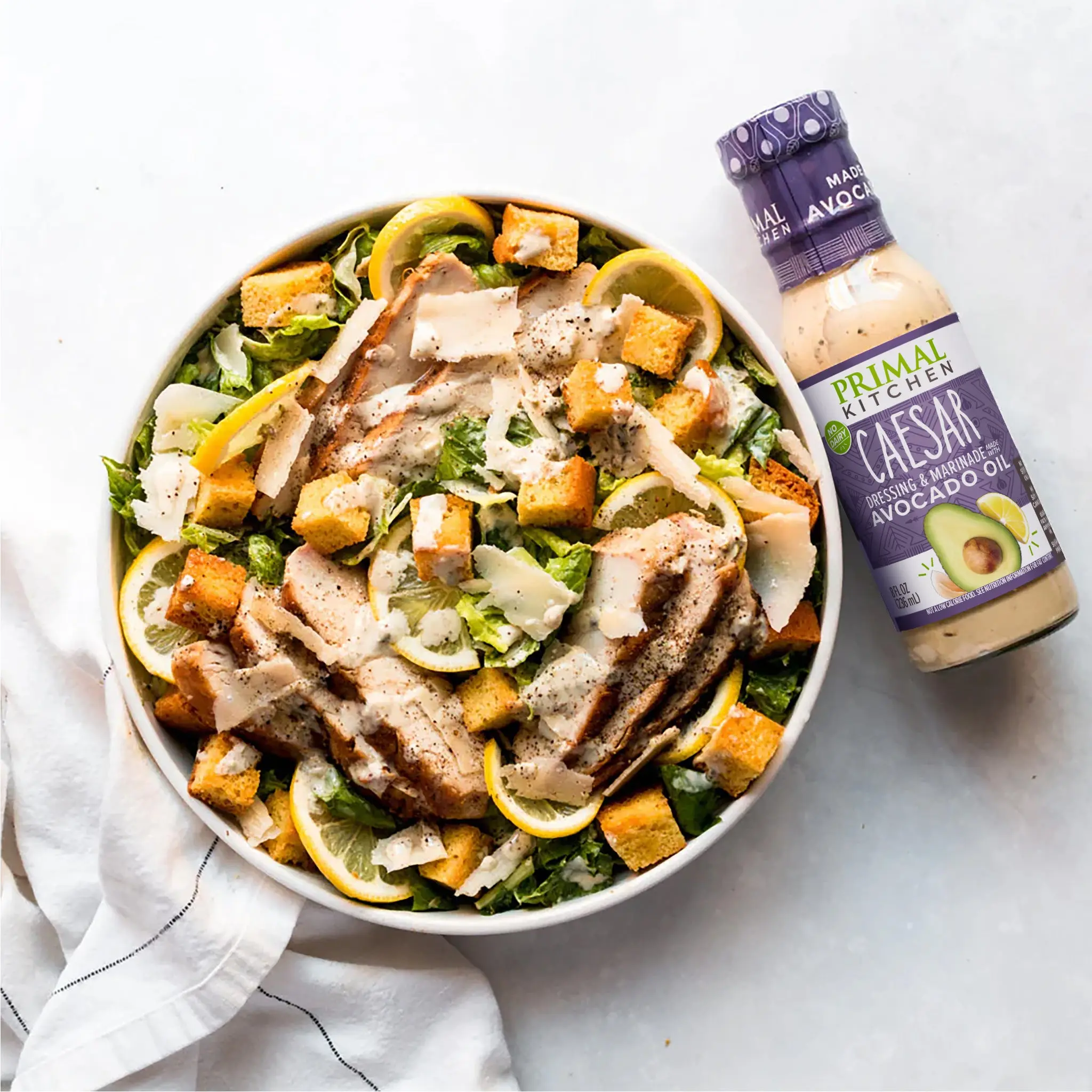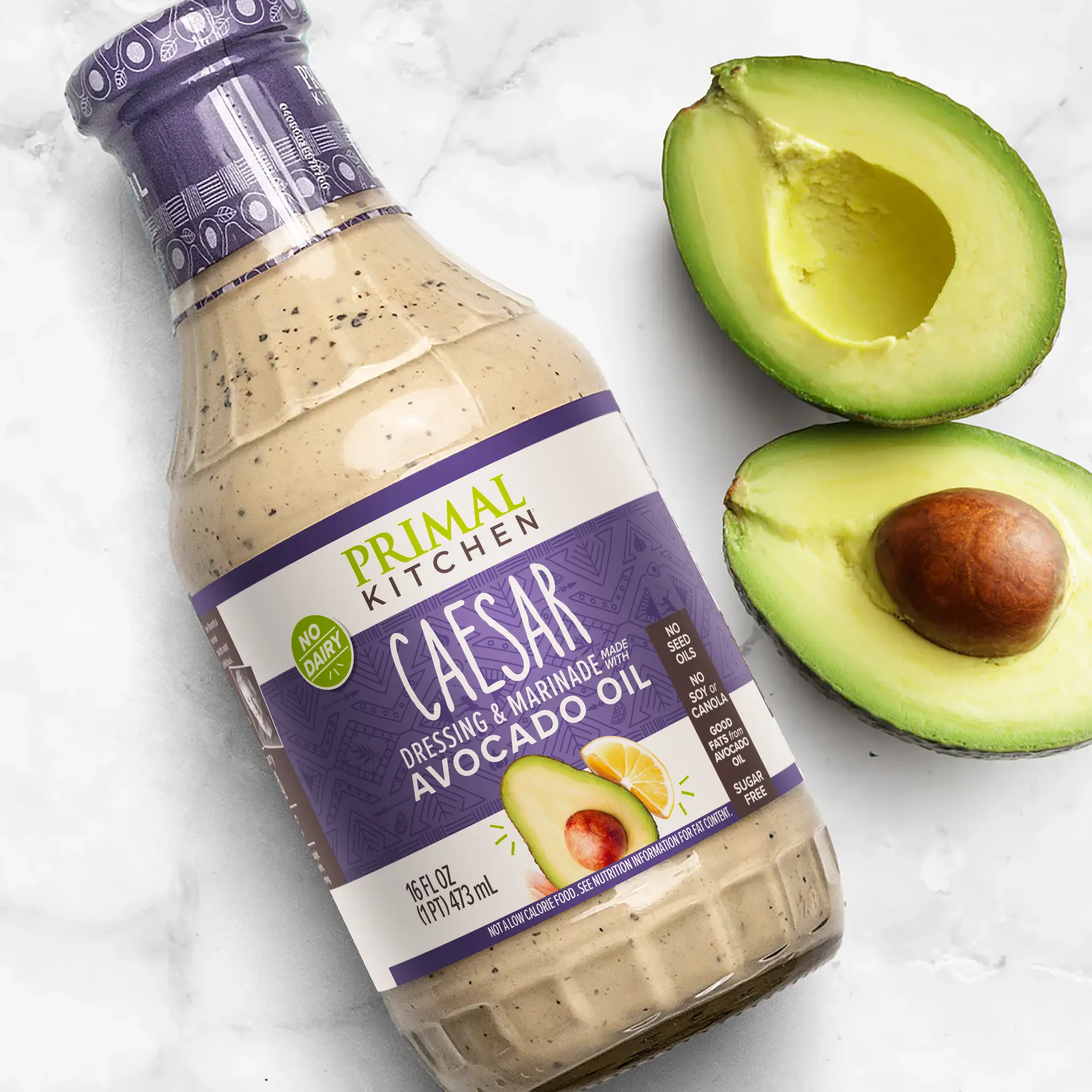 Primal Kitchen® Caesar Dressing & Marinade packs all the creamy, classic garlic and lemon flavors you love without the dairy, gluten, or anchovies.