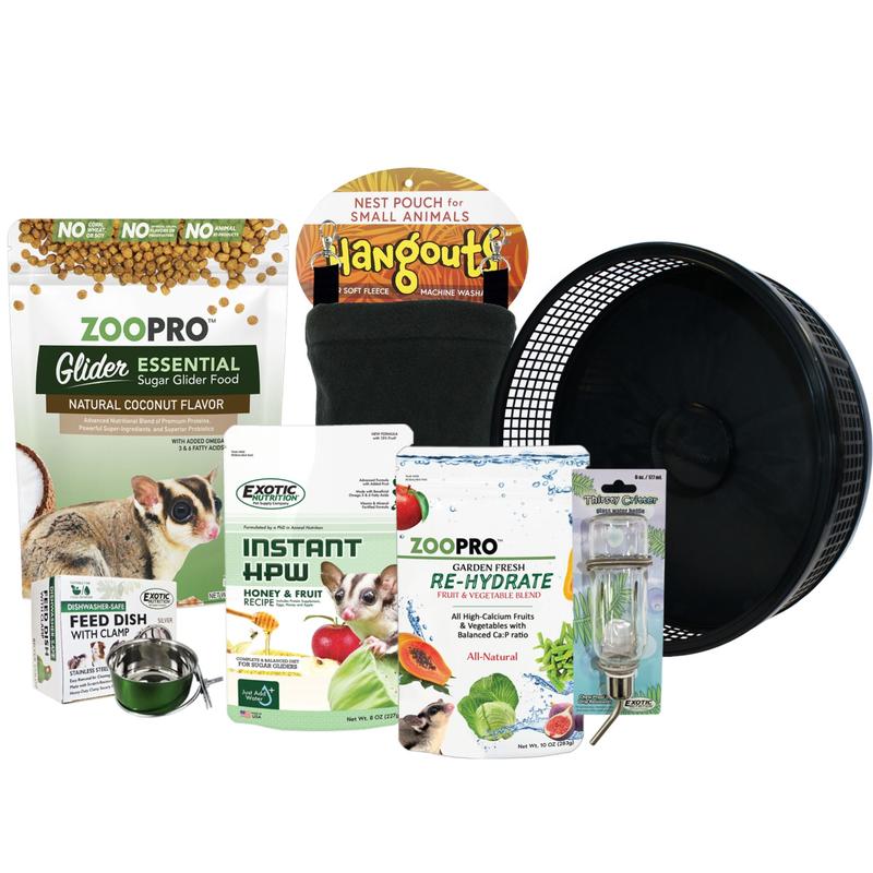 Perfect for new sugar glider owners, this complete starter package includes all the essential items you need for caring for your pet. With the high-quality Silent Runner PRO exercise wheel, Deluxe Nest Pouch, ZooPro Glider Essential food, Instant-HPW food, Garden Fresh Re-Hydrate fruits & vegetables, as well as a stainless steel feed dish and handing water bottle, you can rest easy knowing your sugar glider is receiving the best nutrition and care.