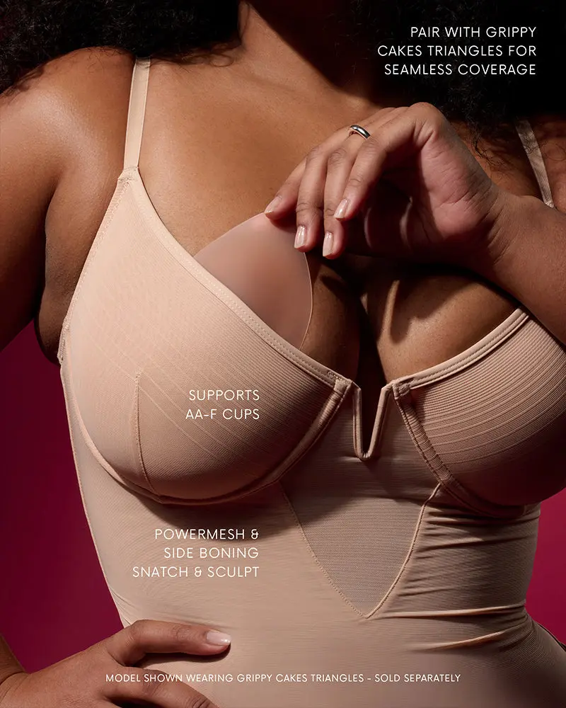 This product is a final sale. The model is shown wearing grippy cakes triangles, which are sold separately. Perfect for those seeking a sculpting and supportive top.