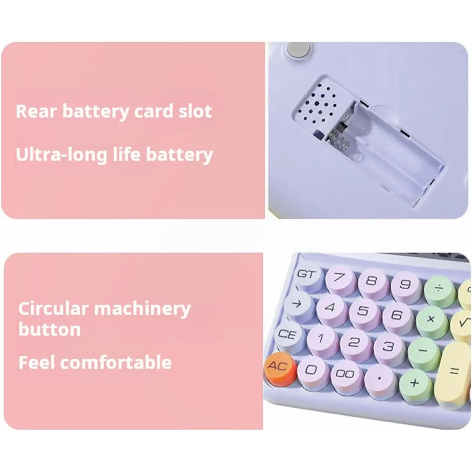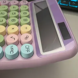 This calculator is stunning! The color is beautiful and the keys are large and perfect. The noise when you push a key it's so soothing! The best calculator! It takes 1 AAA battery. I would definitely recommend, especially if you enjoy the typing sound. (So soothing/relaxing).