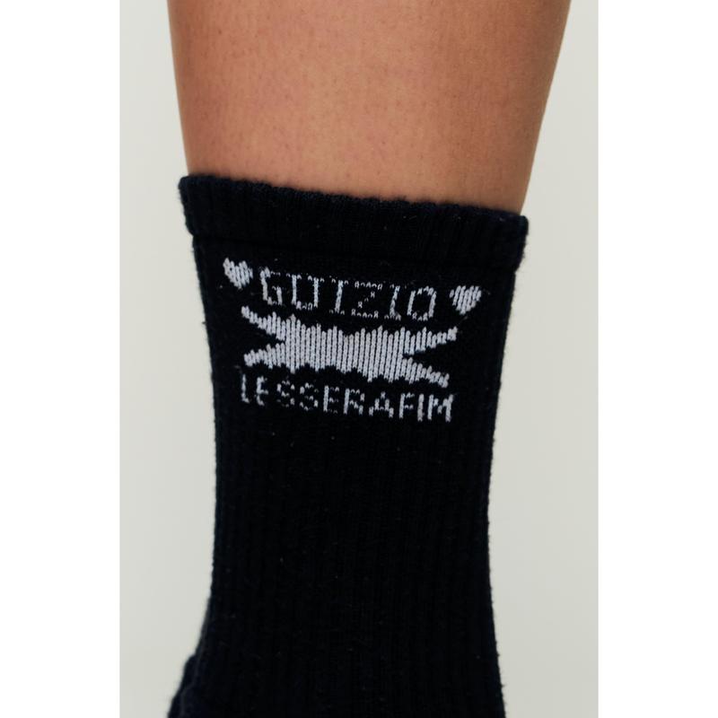 ·The Calf Socks bring a playful finishing touch to the Guizio x Le Sserafim collaboration. Knit in soft, breathable cotton with a ribbed structure, the pair is embroidered with the collab lock-up and subtle heart motifs. Designed to hit mid-calf, they’re the versatile accessory that ties the capsule together—whether styled with loafers, Mary Janes, or sneakers.
