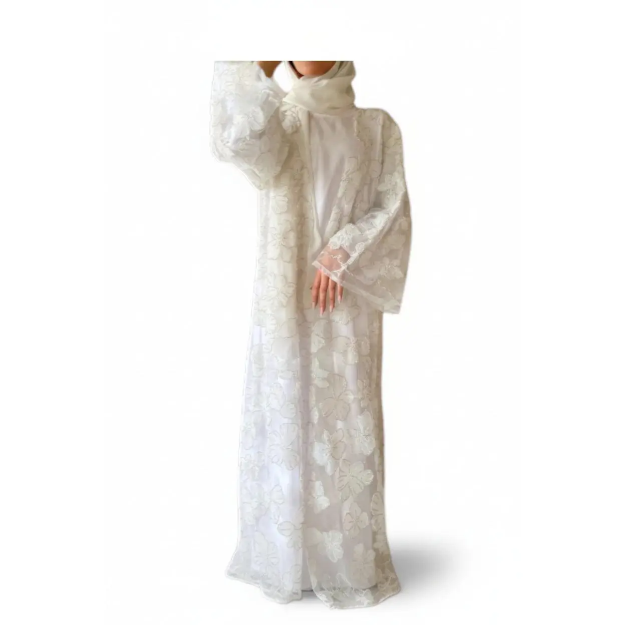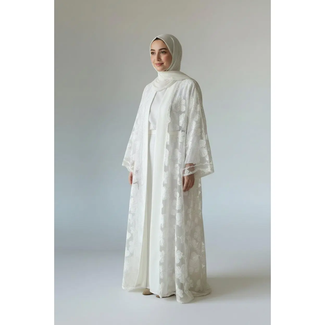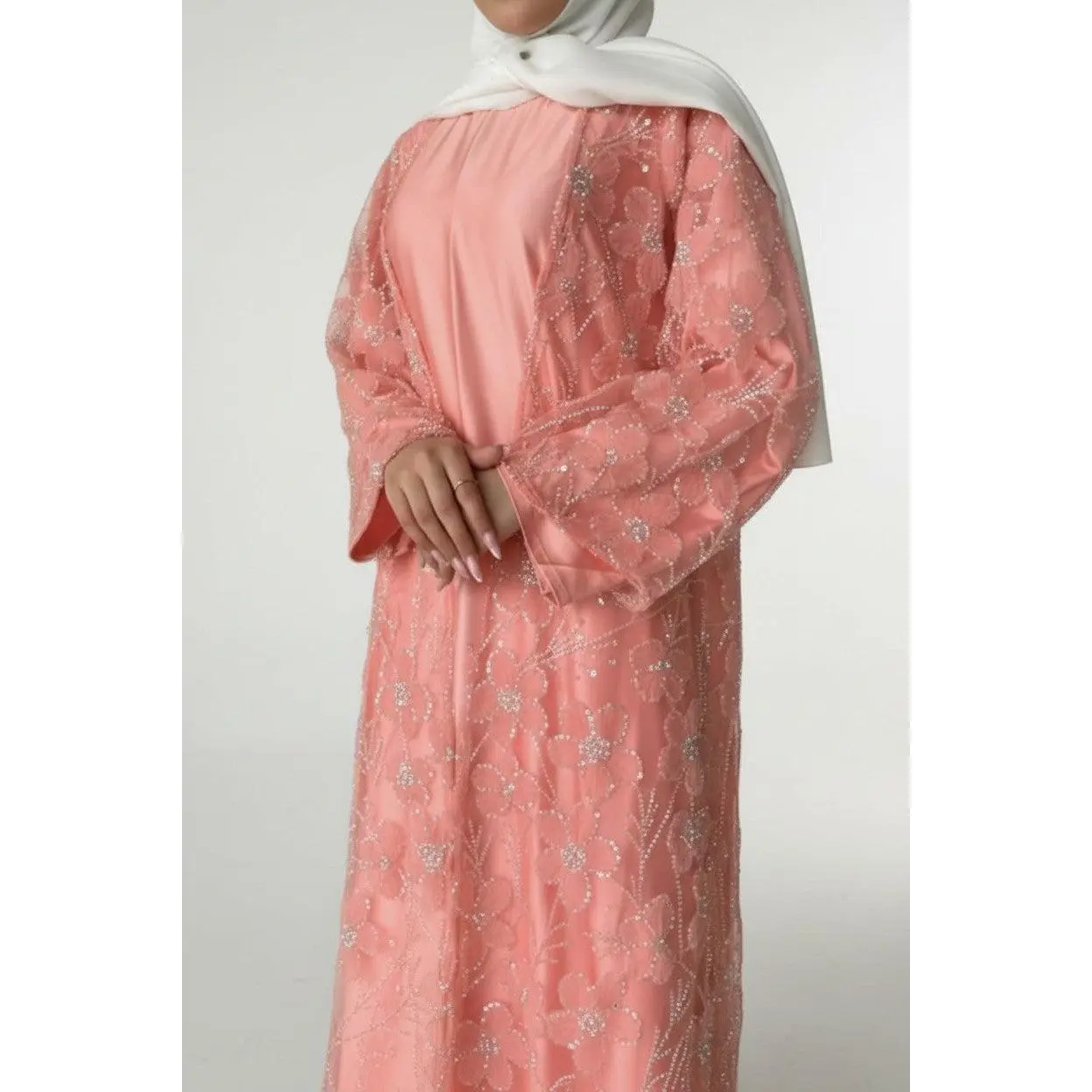 The Caliana Abaya is designed with a sheer embroidered overlay and delicate floral detailing throughout, this piece adds texture and movement without feeling heavy. The subtle shimmer woven into the floral pattern catches light beautifully, making it perfect for weddings, formal dinners, or special gatherings.