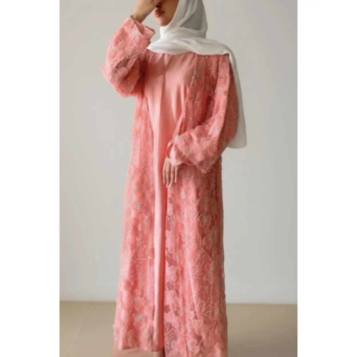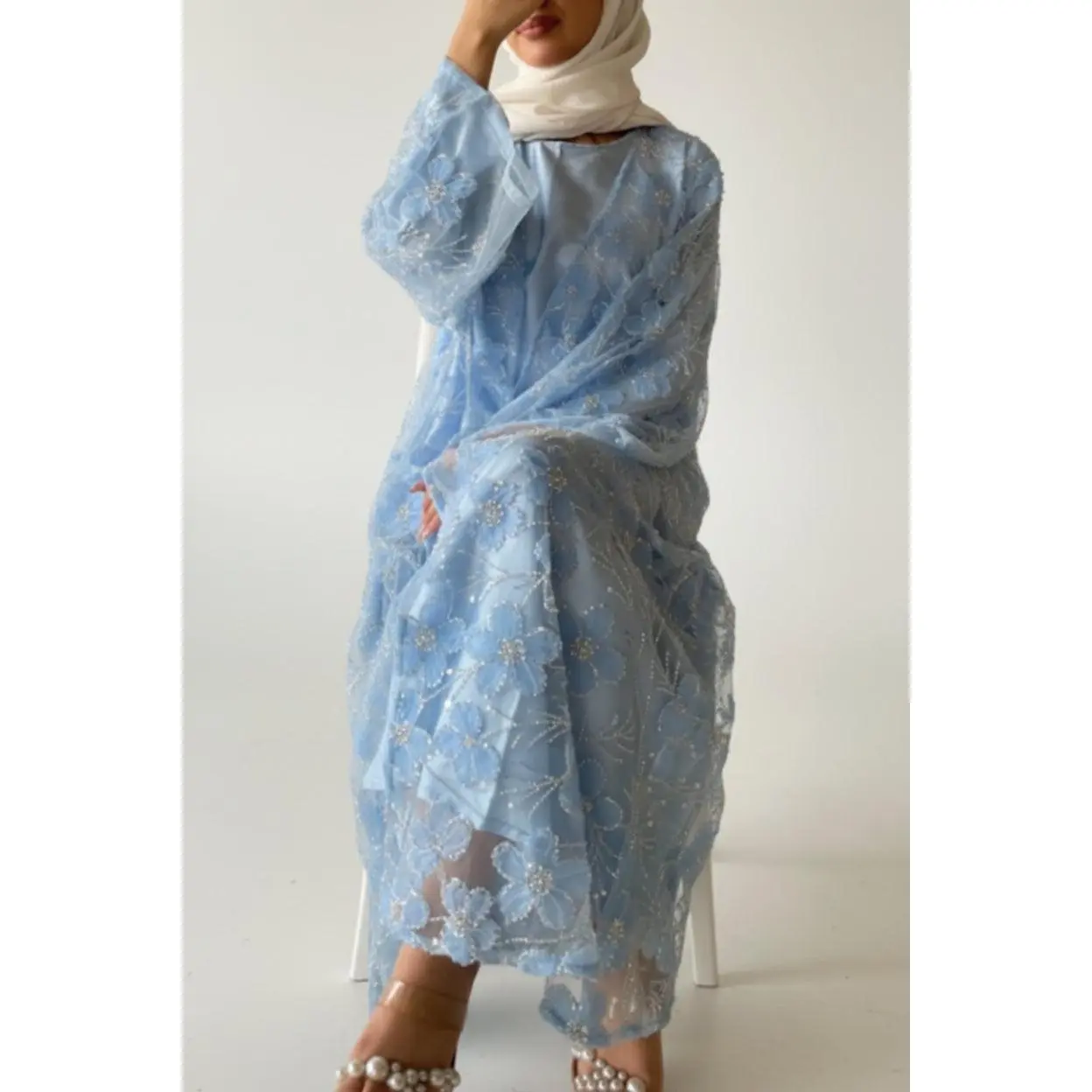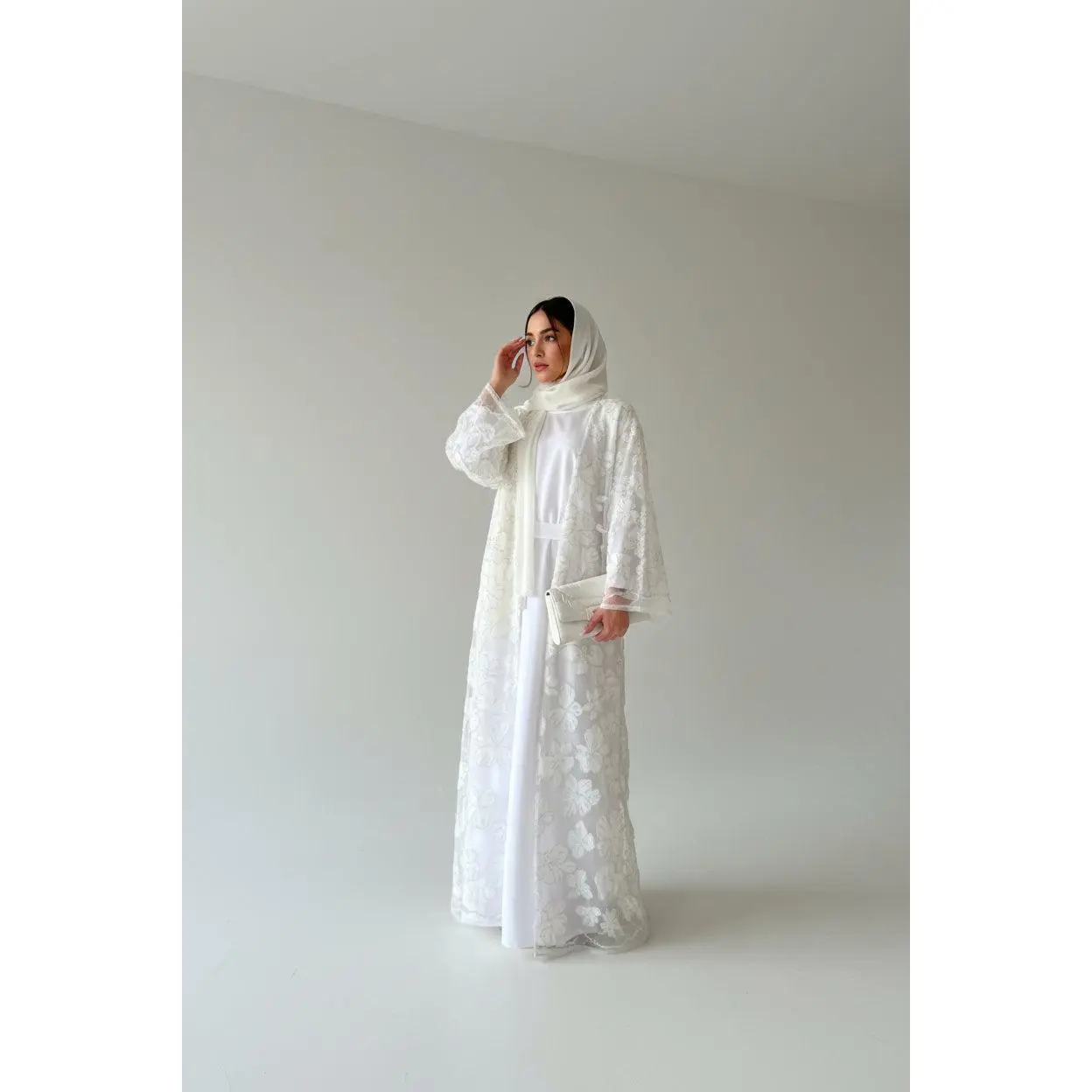The Caliana Abaya is designed with a sheer embroidered overlay and delicate floral detailing throughout, this piece adds texture and movement without feeling heavy. The subtle shimmer woven into the floral pattern catches light beautifully, making it perfect for weddings, formal dinners, or special gatherings.