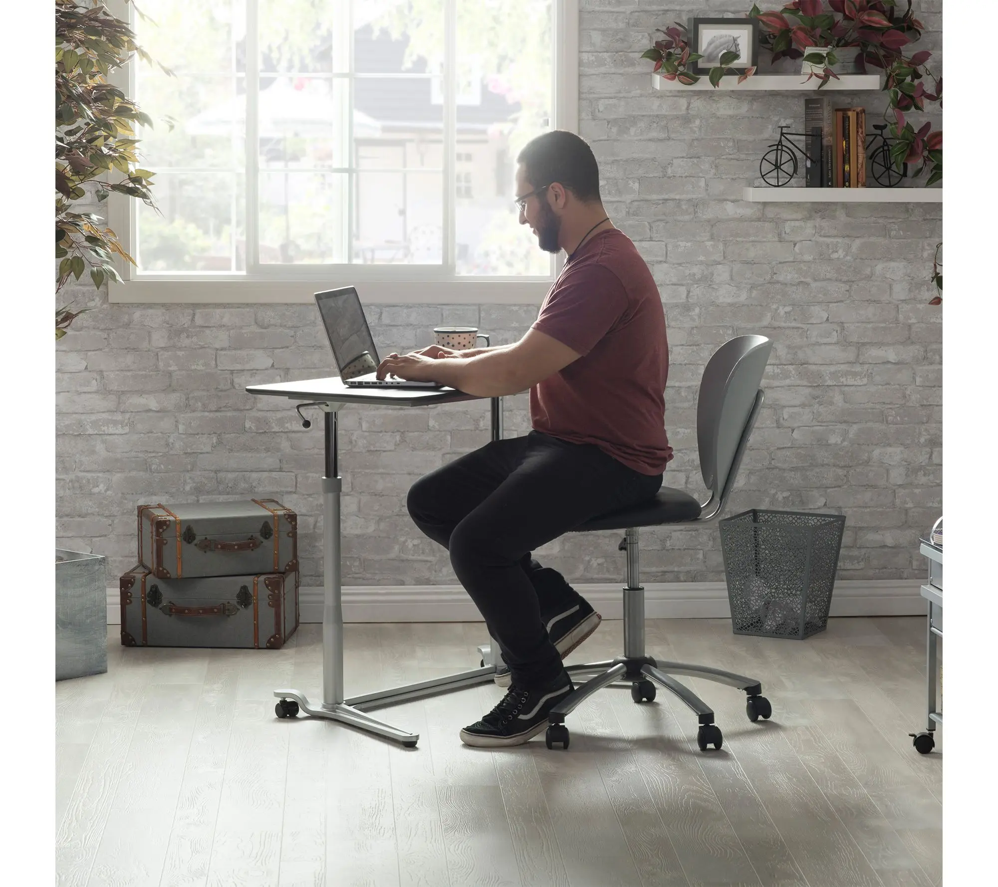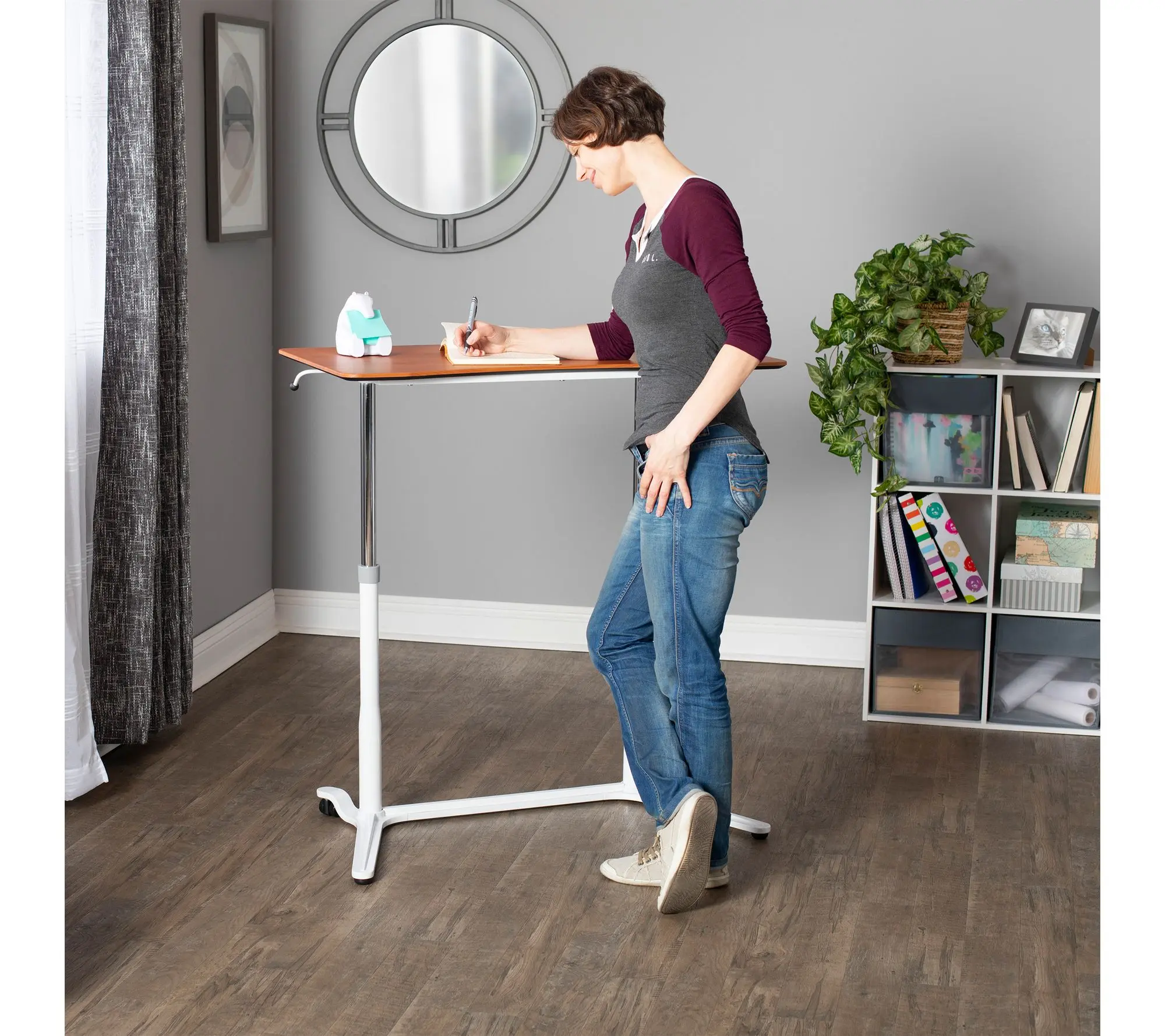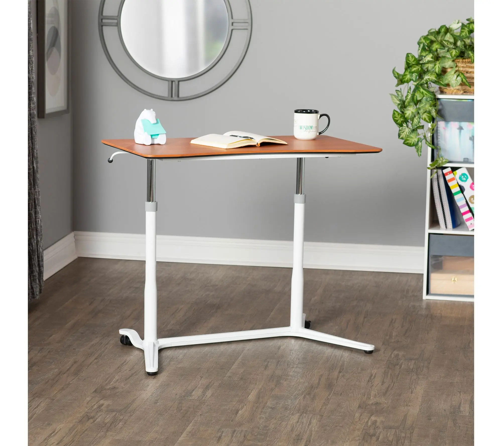 Find inspiration in every task with this adjustable sit-to-stand desk, designed to transition seamlessly as you move through busy days at home or in your office. Dual levers, sleek finishes, and locking casters offer flexible function for everything from focused work sessions to creative projects. From Calico Designs.