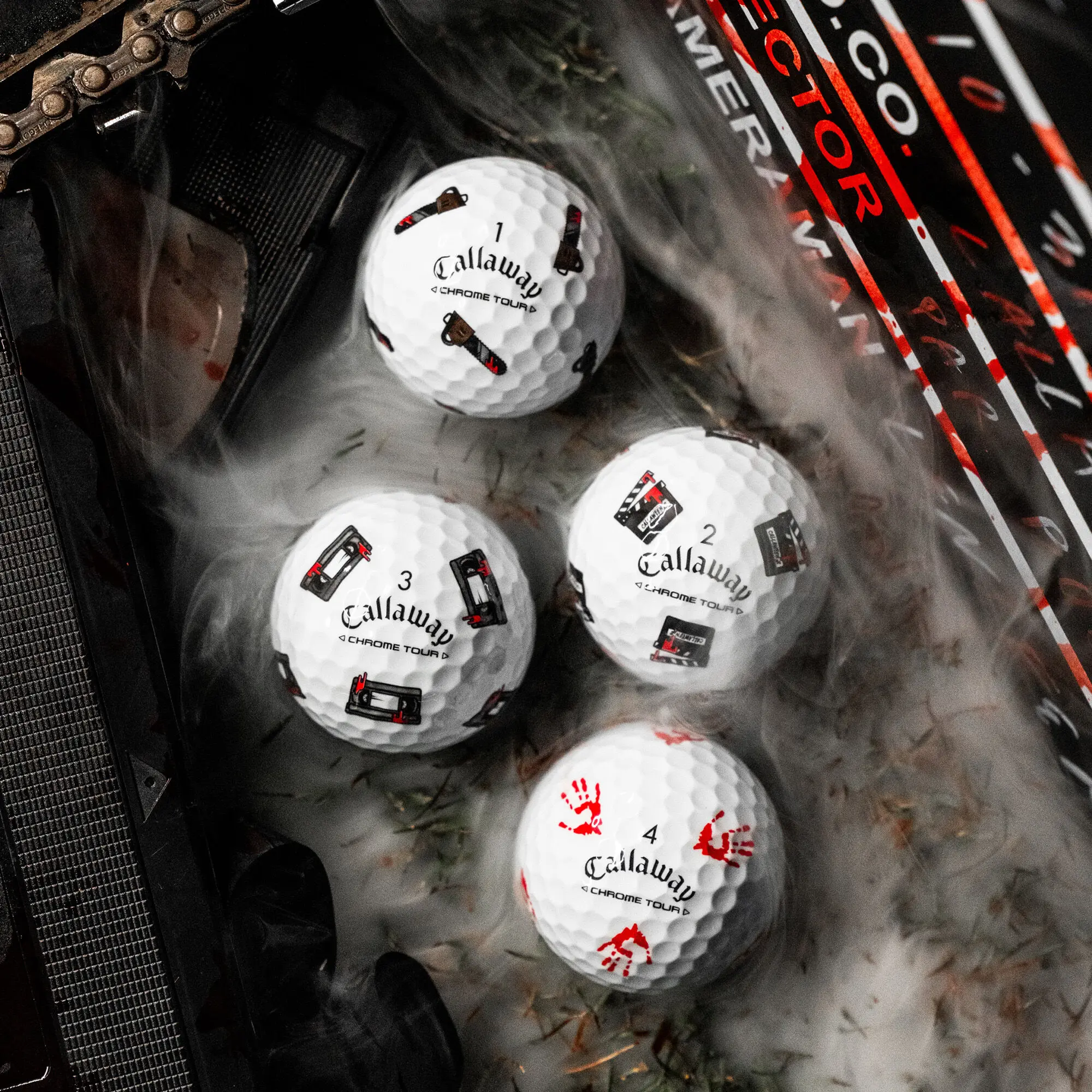 Play if you dare. Inspired by classic scary movies, Chrome Tour Halloween delivers bold designs with a frightening edge. Featuring a handprint, chainsaw, VHS tape, and eerie movie clapper, this collection brings a striking aesthetic to your game. Combined with the Tour-level performance you trust, this drop is scary good.